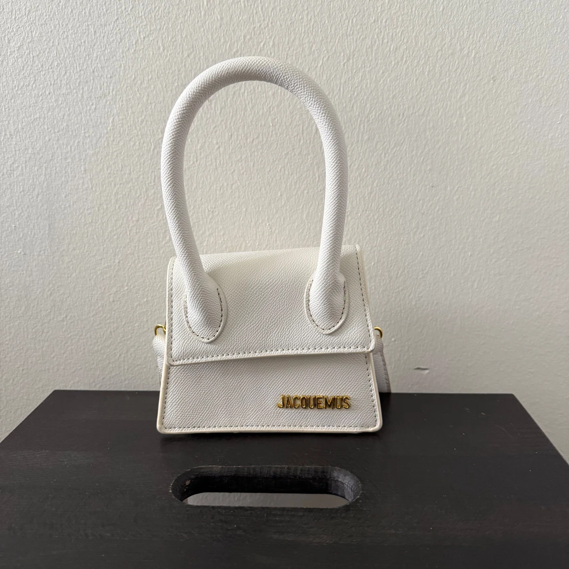 Superfin vit handväska från Jacquemus med unik form och böjda handtag. Väskan har guldfärgad logga framtill och en avtagbar axelrem. Tillverkad i strukturerat skinn med stilrena detaljer och minimalistisk design. Perfekt för dig som gillar trendiga accessoarer.