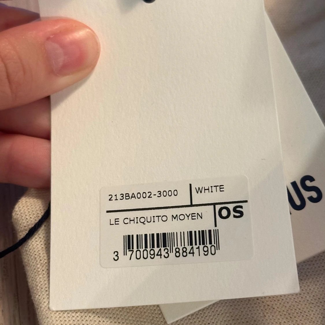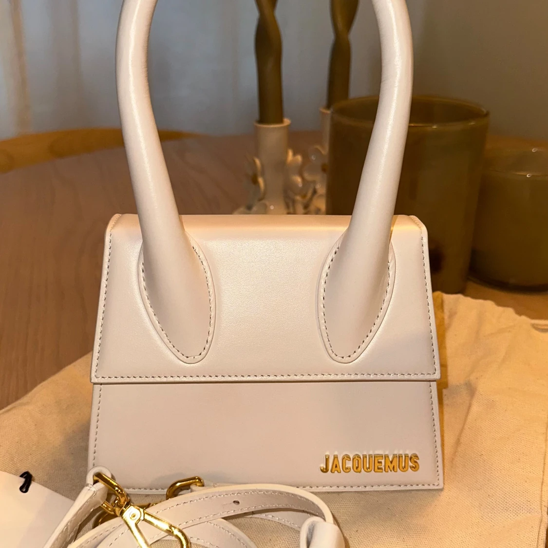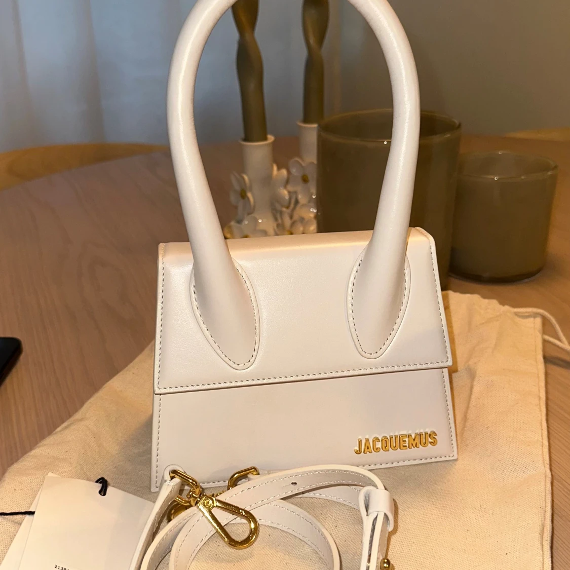 Superfin liten handväska från Jacquemus i vit skinn med guldiga detaljer och logga framtill. Väskan har ett stilrent och modernt uttryck med rundade handtag och avtagbar axelrem. Nypris: 7900. Väskan är aldrig använd. Totebag medföljer.