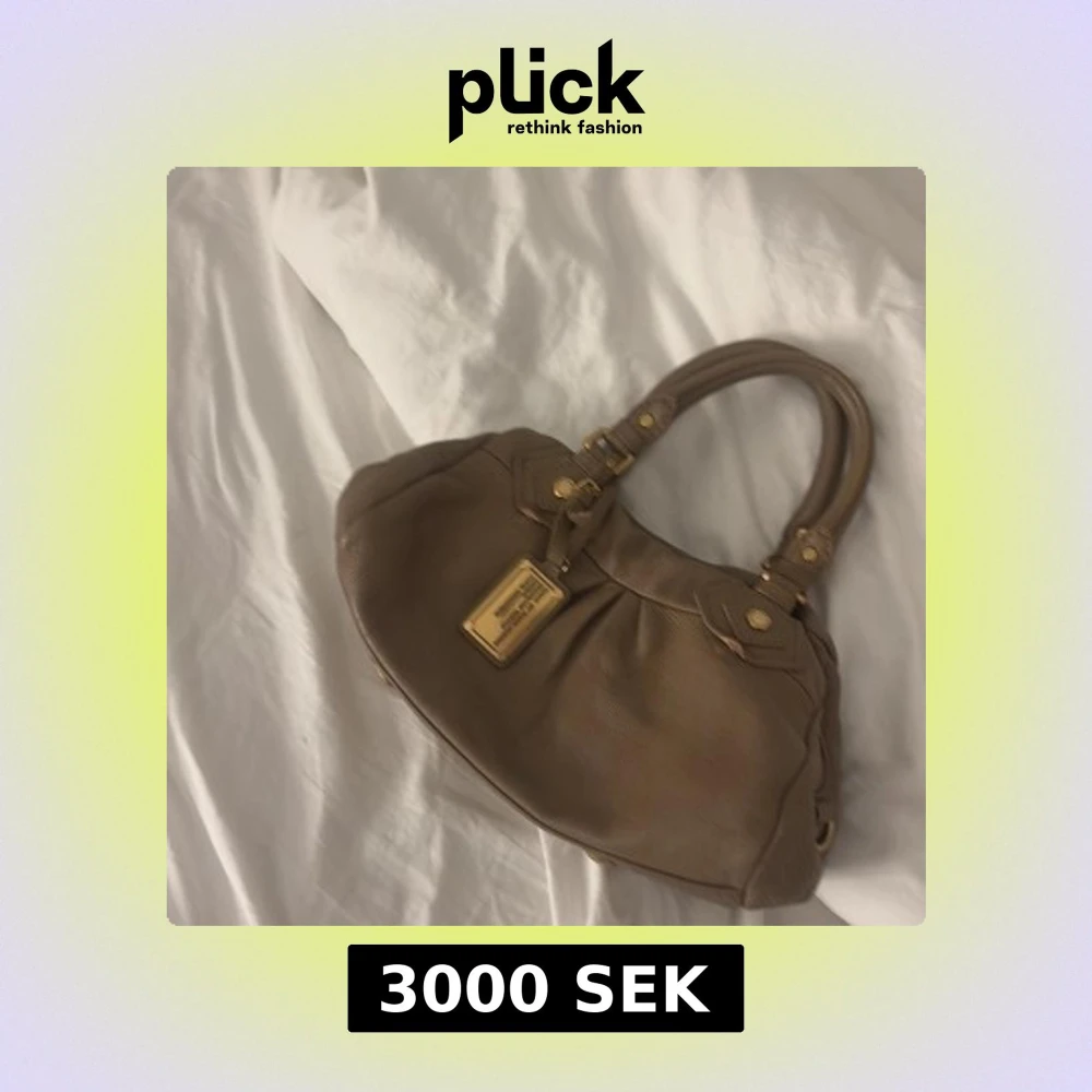 Snygg beige handväska från Marc Jacobs i mjukt skinn med guldfärgade metalldetaljer och dubbla handtag. Väskan har en dekorativ metallbricka framtill och coola sömmar som ger den en unik look. Perfekt storlek för att få plats med allt viktigt.
