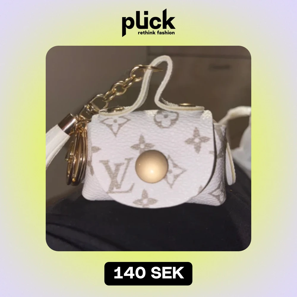 Säljer en superfin vit mini handväska med monogrammönster. Den har en snygg guldfärgad kedja och en liten tofsdetalj. Perfekt som en liten accessoar eller nyckelring. Väskan har en tryckknapp för att hålla den stängd.