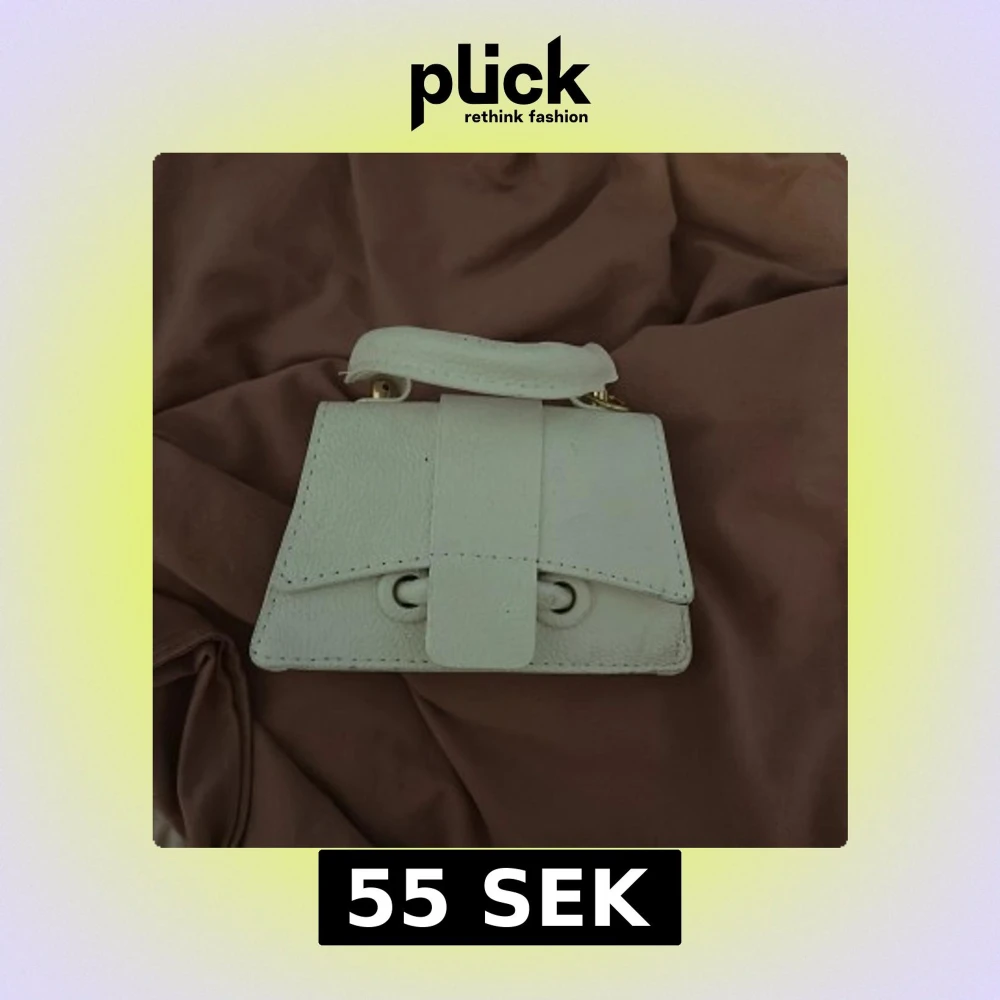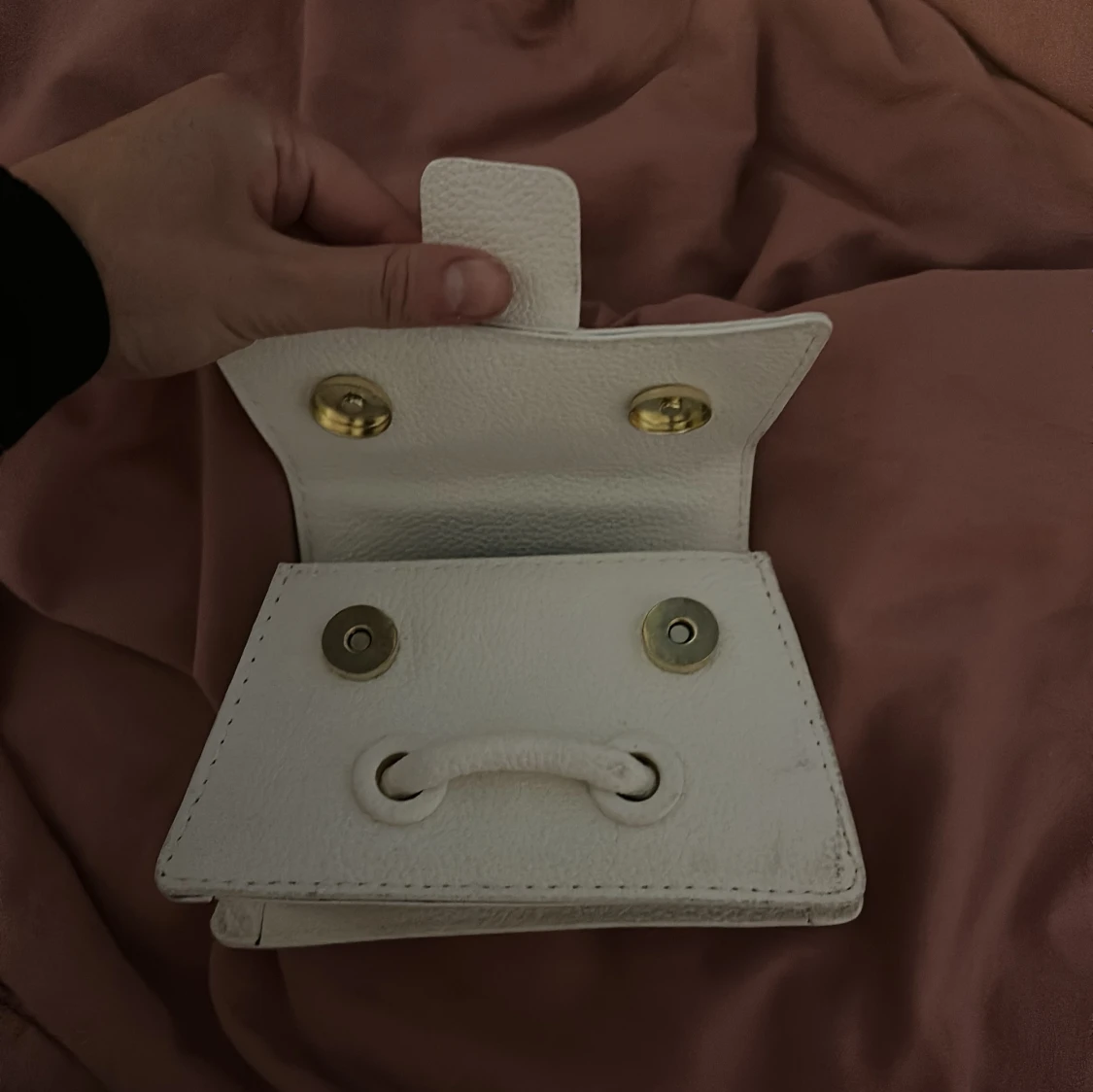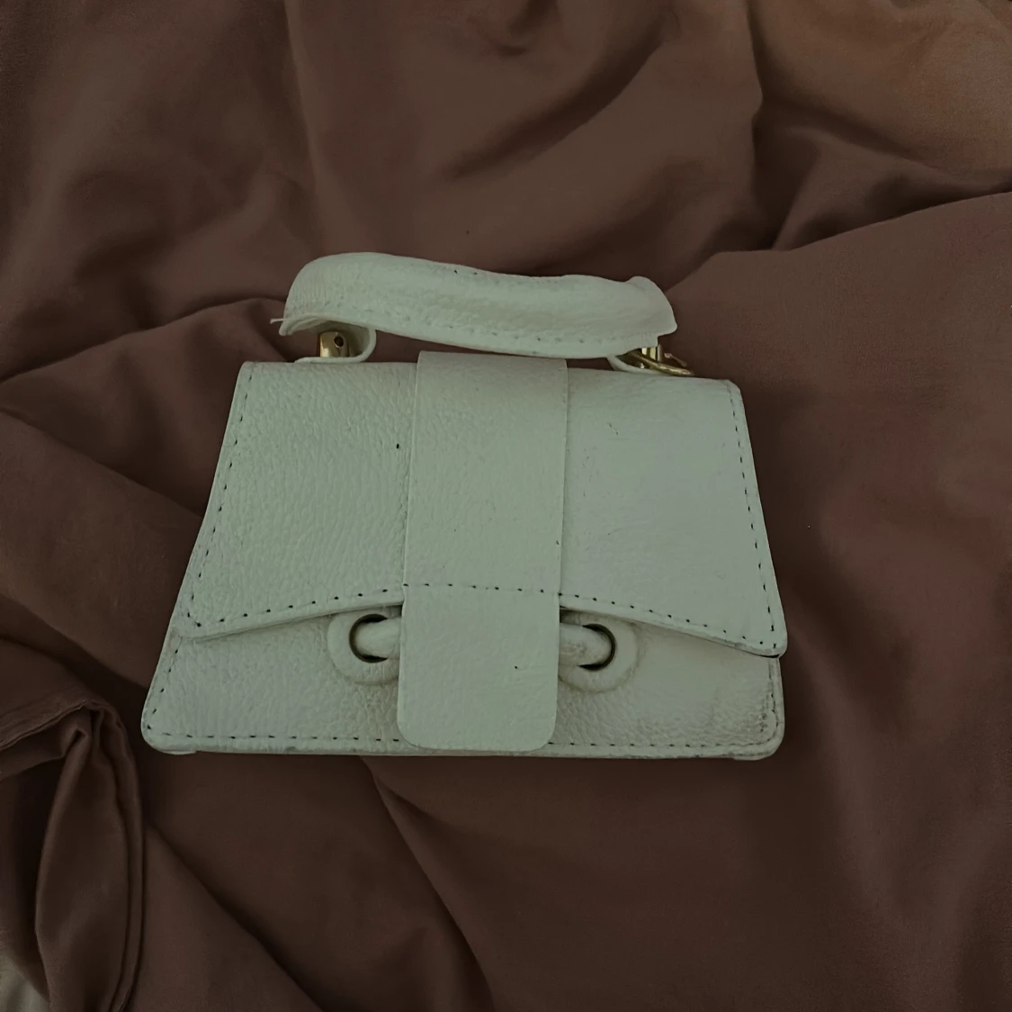 Superfin liten handväska i vitt skinn med stilren design och guldfärgade detaljer. Väskan har ett kort handtag upptill och stängs med magnetknappar. Perfekt för att bära det viktigaste och ger en clean look till din outfit.
