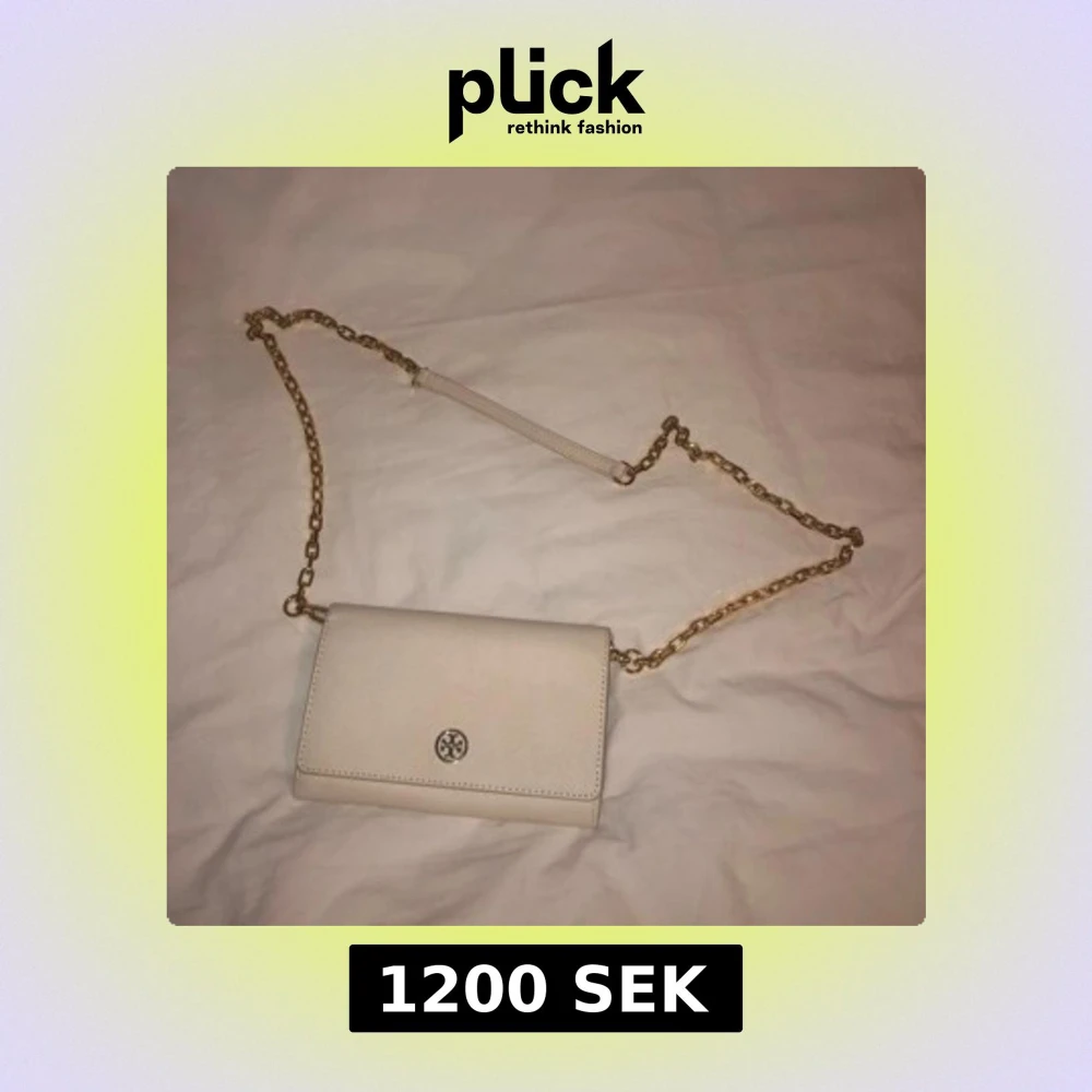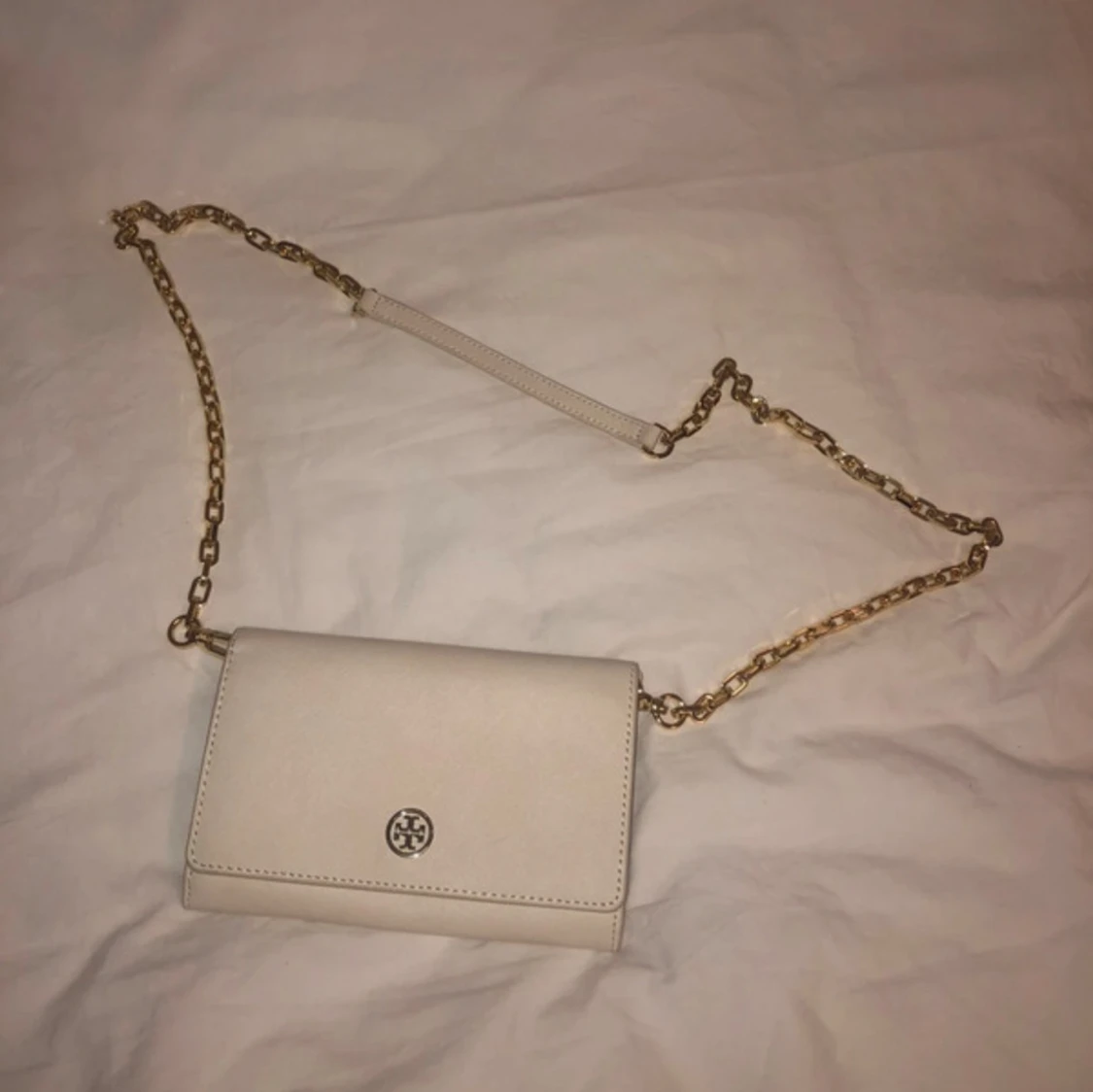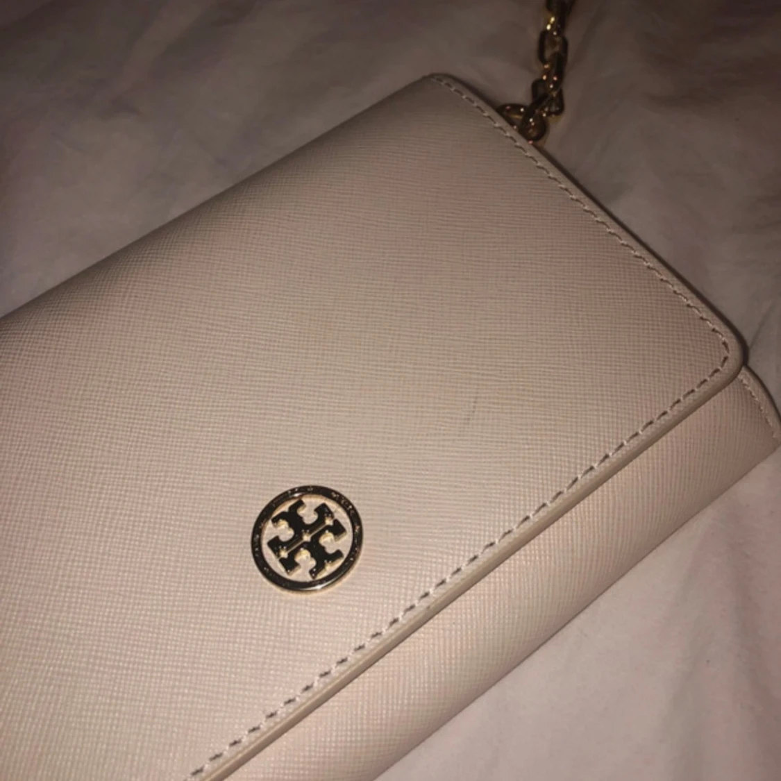 Snygg beige axelväska från Tory Burch med guldfärgad kedja och klassisk logga framtill. Väskan är i slätt skinn med stilren design och har ett praktiskt axelband med kedjedetaljer. TYVÄRR HAR VÄSKAN SMÅ DEFEKTER. De två sista bilderna visar defekterna