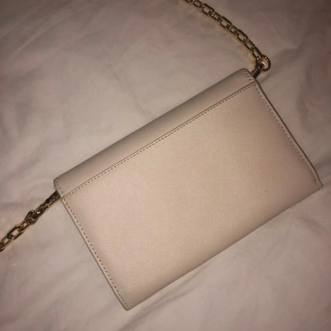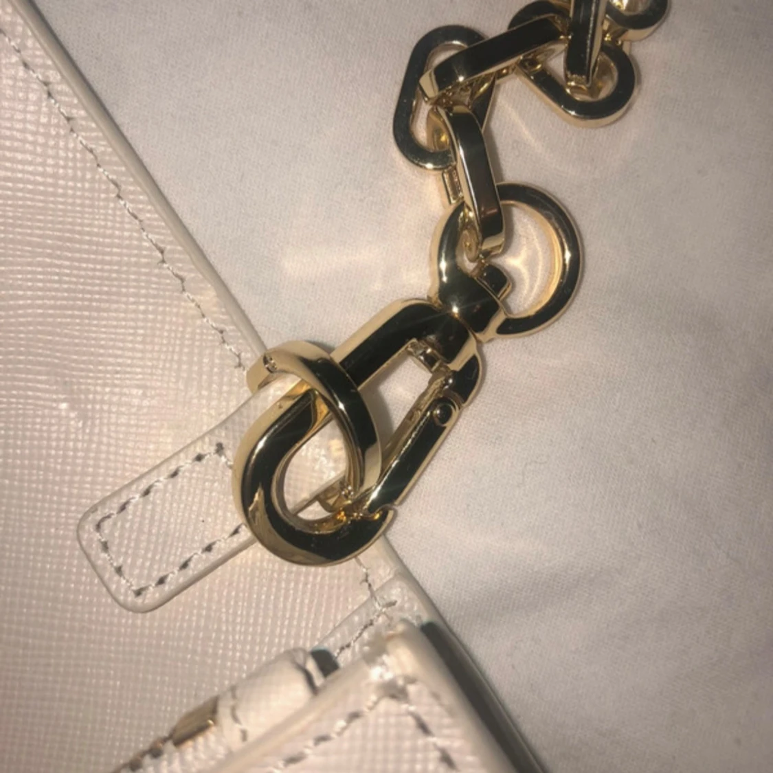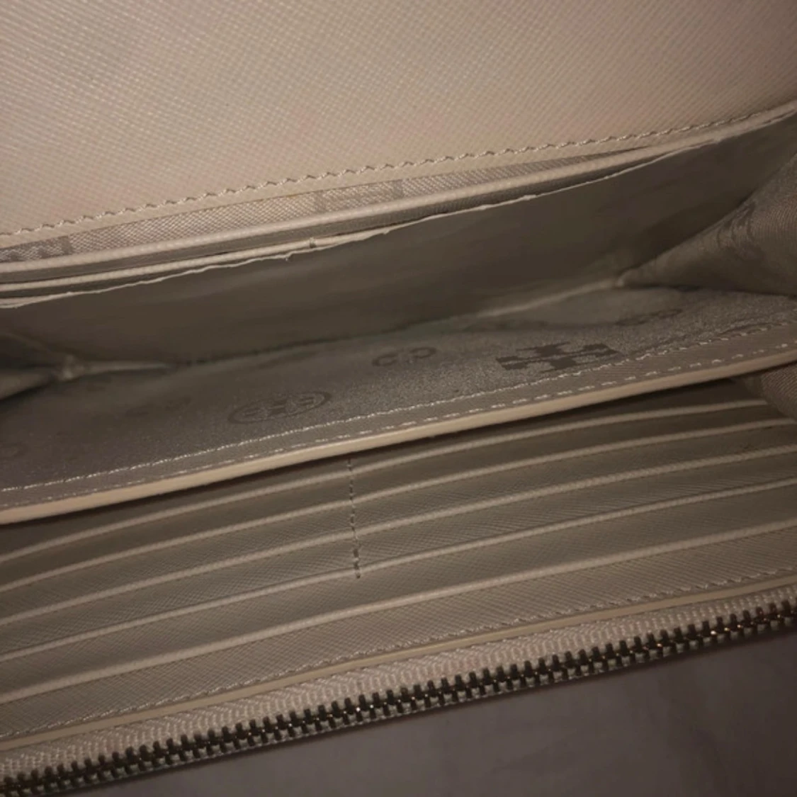 Snygg beige axelväska från Tory Burch med guldfärgad kedja och klassisk logga framtill. Väskan är i slätt skinn med stilren design och har ett praktiskt axelband med kedjedetaljer. TYVÄRR HAR VÄSKAN SMÅ DEFEKTER. De två sista bilderna visar defekterna