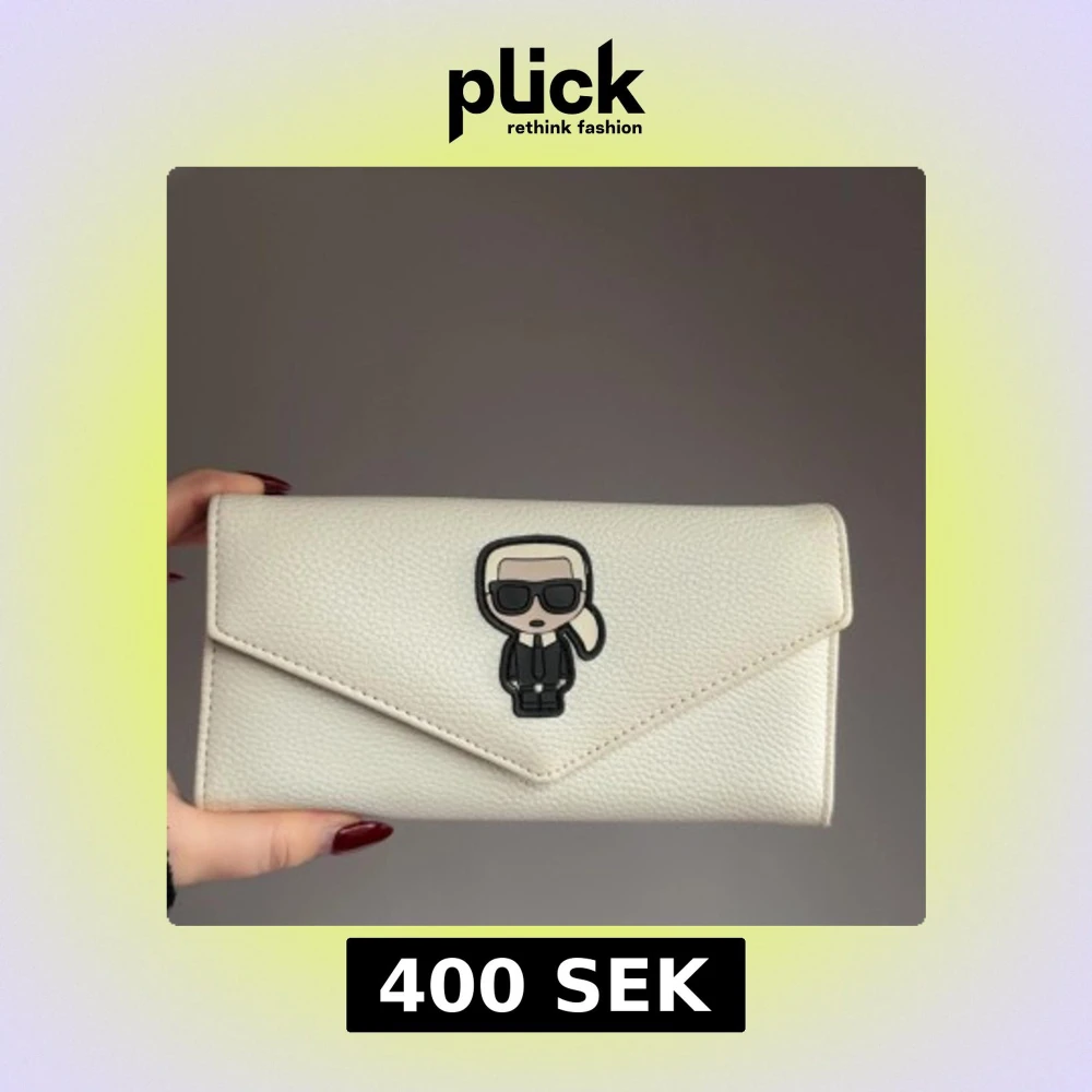 Vit plånbok i skinnimitation som liknar Karl Lagerfeld med den ikonisk Karl-figur på framsidan. Plånboken har kuvertformad design, flera kortfack, fönster för ID och dragkedjefack för mynt. Perfekt för dig som gillar stilrena accessoarer med en twist. Plånboken är ej äkta