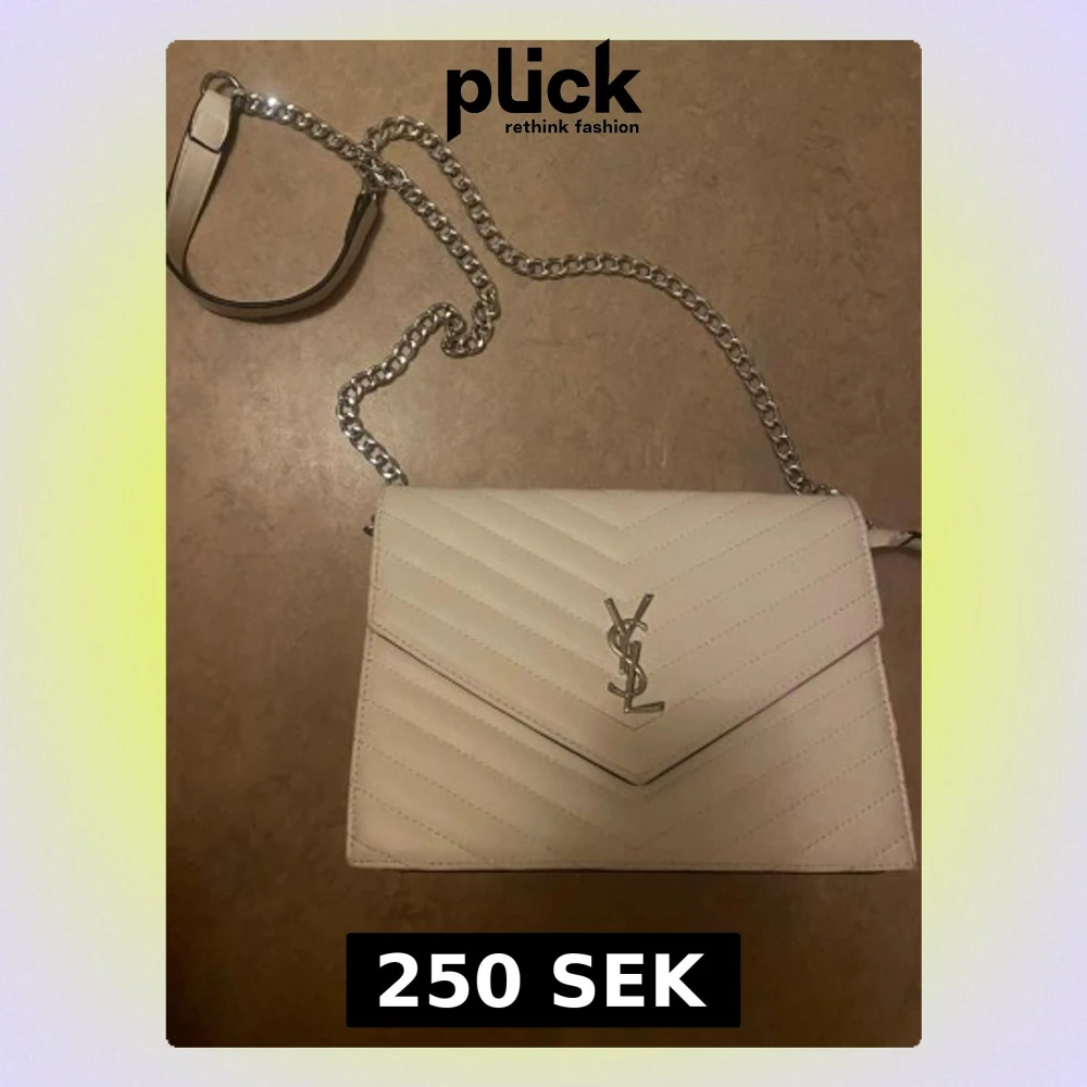 Snygg vit axelväska från YSL med silverkedja och ikonisk YSL-logga framtill. Perfekt storlek för att bära med sig det viktigaste och ger en lyxig vibe till din outfit.