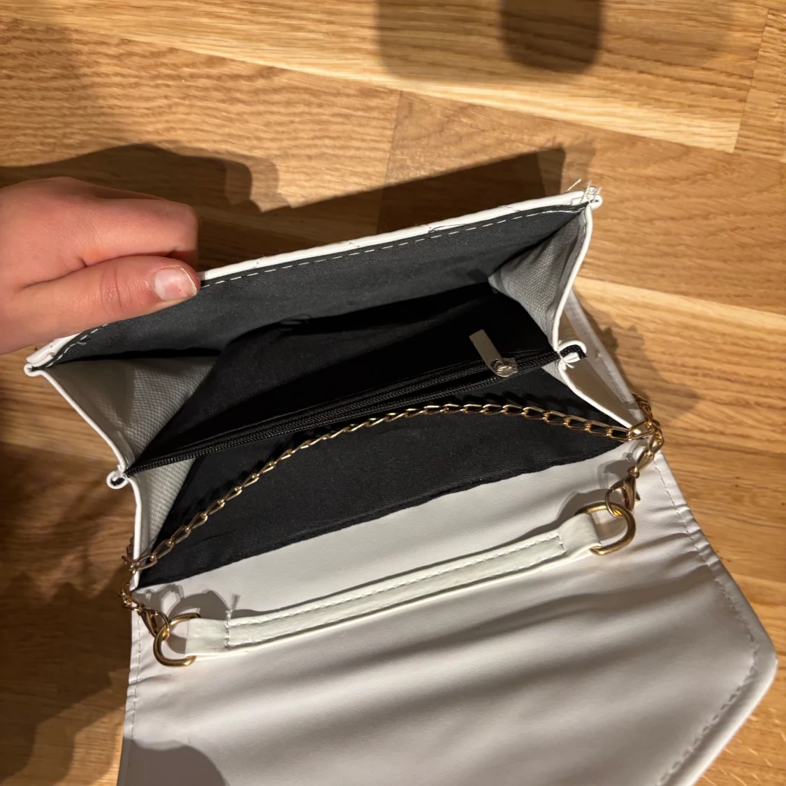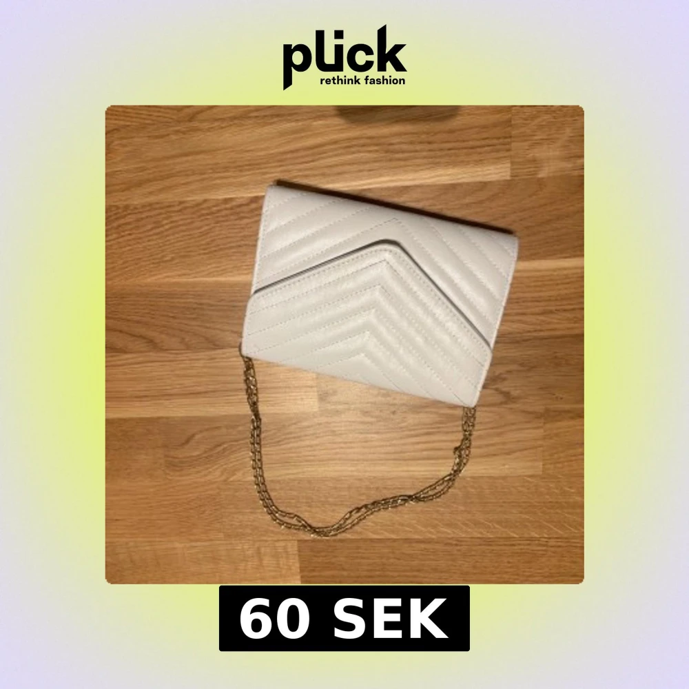 Säljer en stilren vit axelväska med quiltat mönster och guldfärgad kedja. Väskan har ett innerfack med dragkedja och stängs med lock. Perfekt för att lyfta din outfit!