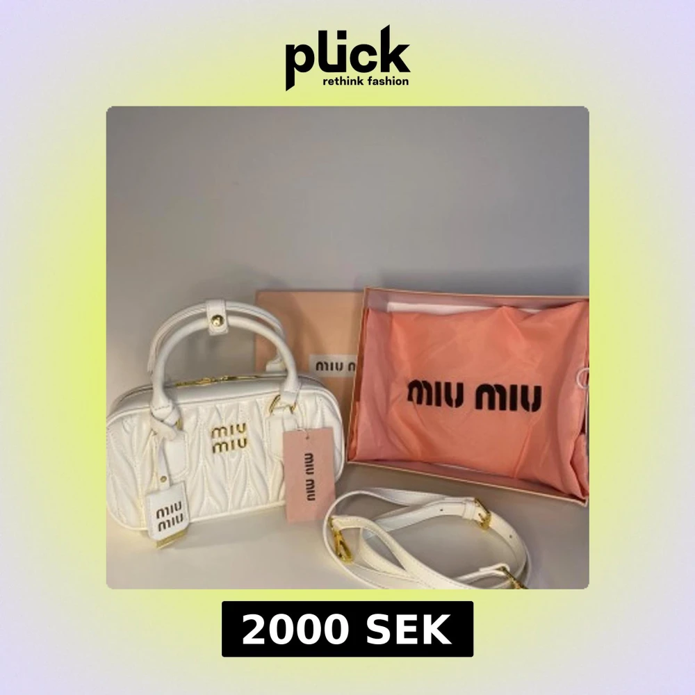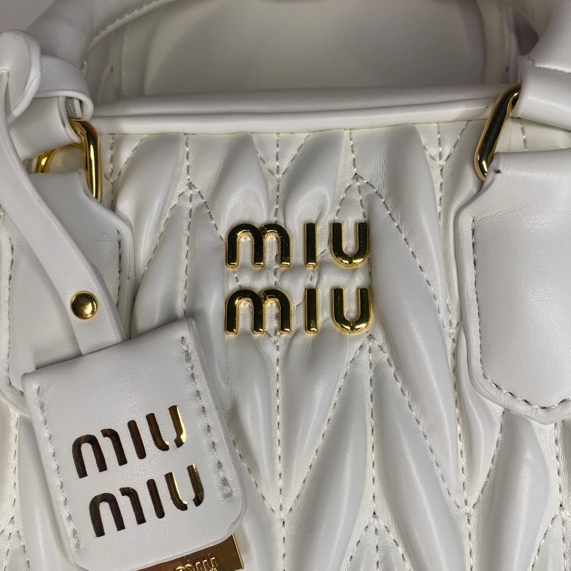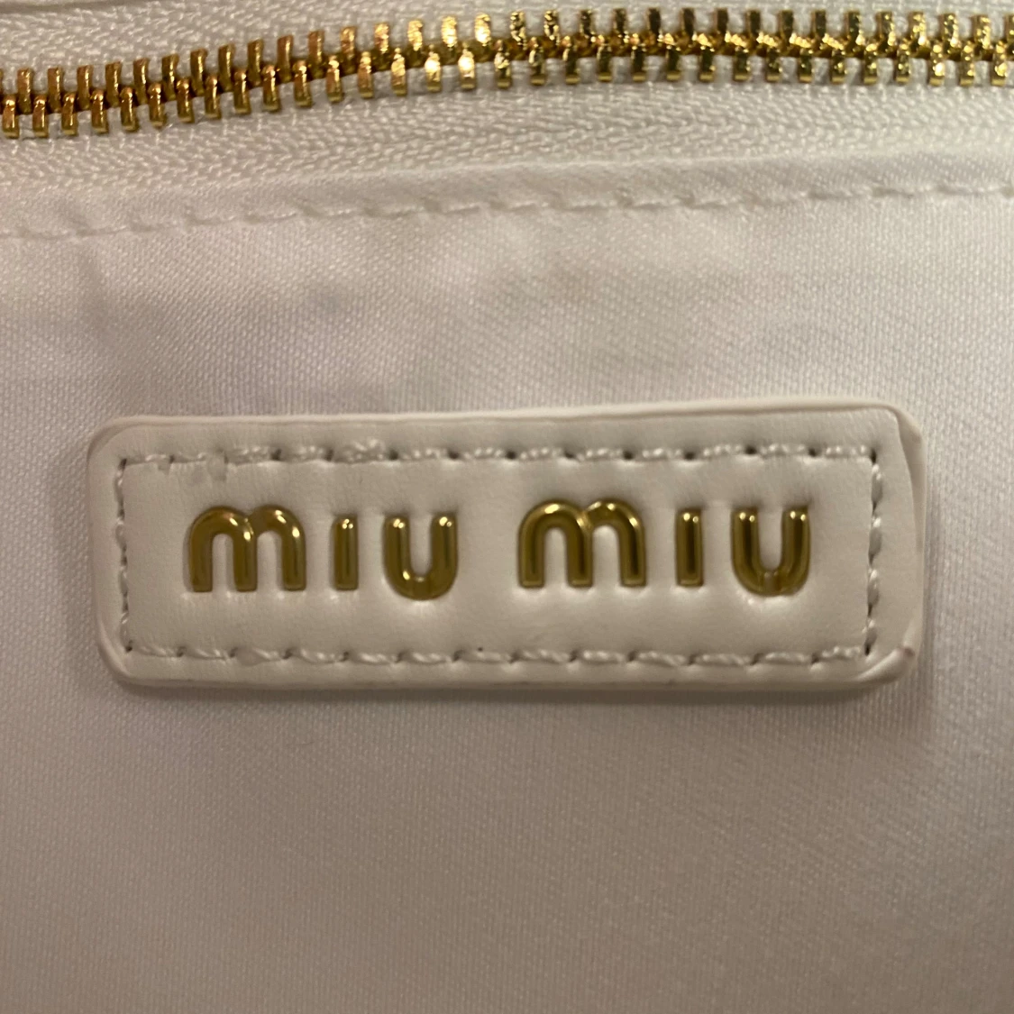 Superfin vit handväska från Miu Miu i quiltat skinn med guldiga detaljer och logga framtill. Väskan har både handtag och avtagbar axelrem, perfekt för att bära på olika sätt. Kommer med originalbox och dustbag. Snygg och lyxig accessoar som lyfter varje outfit.