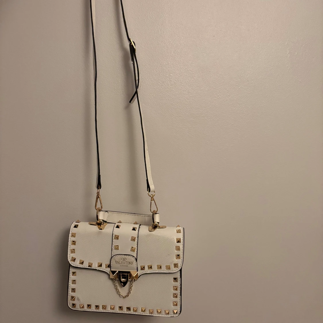 Snygg vit handväska från Valentino Garavani i skinn med guldiga nitar runt kanterna och på locket. Väskan har både handtag och avtagbar axelrem, samt coolt lås med kedjedetalj. Insidan är röd och har fack för småsaker. Perfekt för dig som gillar statement-accessoarer.