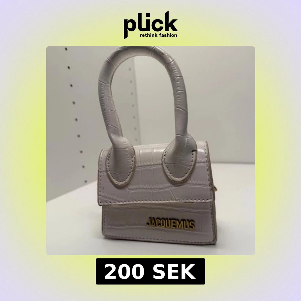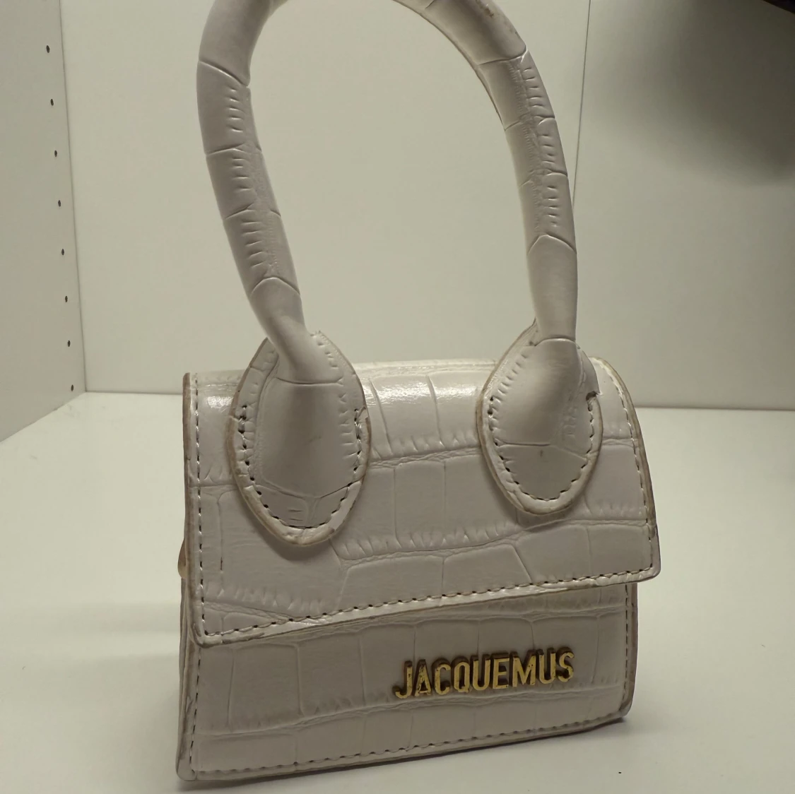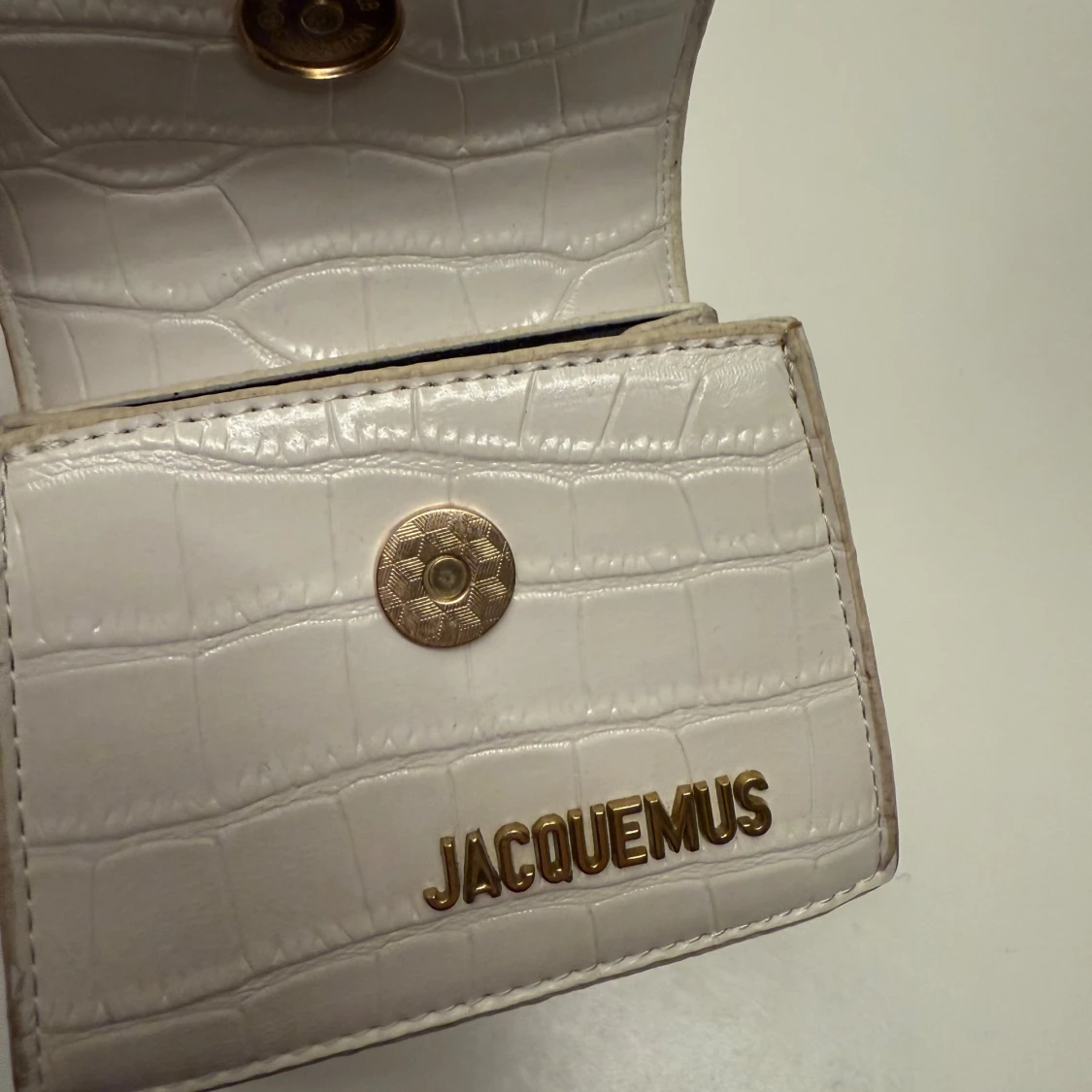 Superfin liten handväska från Jacquemus i vit, glansig skinnimitation med krokopräglat mönster. Väskan har två rundade handtag och guldiga detaljer, inklusive logotypen framtill. Perfekt för dig som gillar trendiga accessoarer med lyxig känsla.