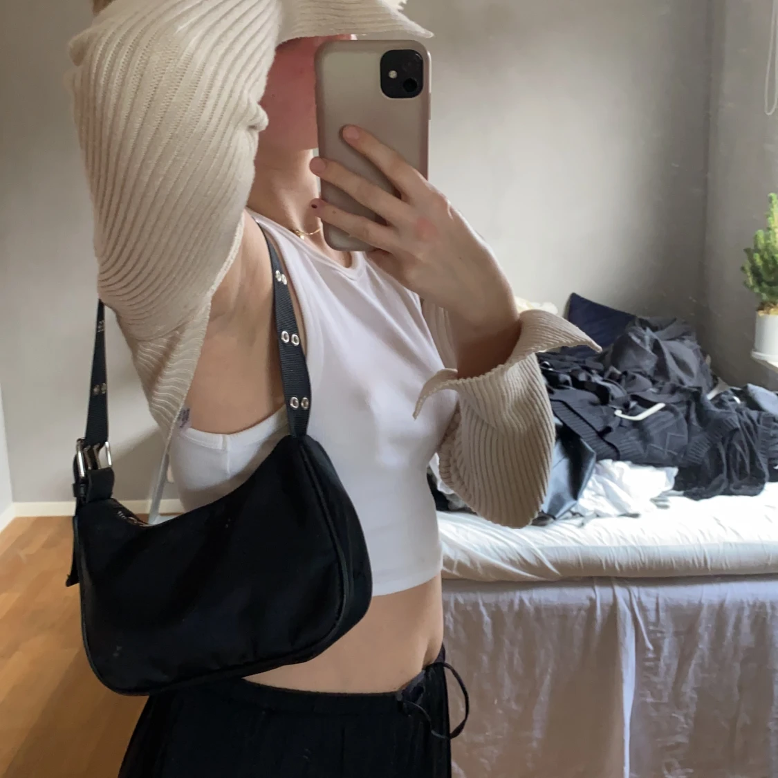 Svart väska i en jättecool design, är sjukt rymlig och får plats med allting när jag använder den, i superbra skick.