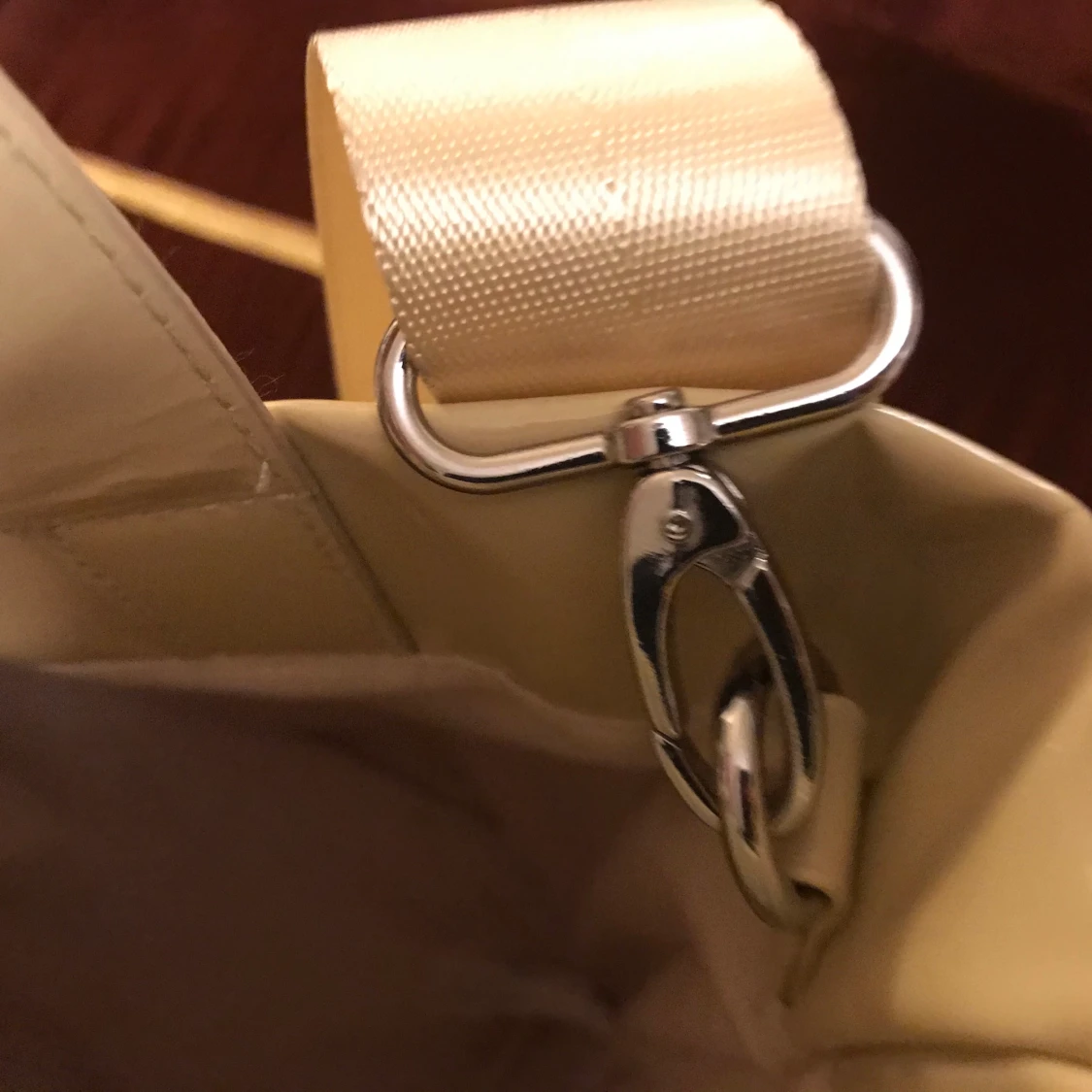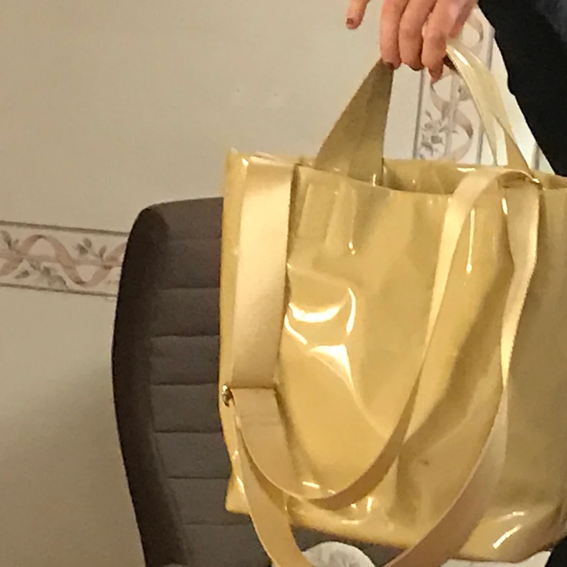 Skitsnygg och praktisk väska💓 skulle beskriva färgen som sandig, väskan är täckt av något glansigt material. Fläcken som syns på bilderna är borta nu!! 💗 kan användas både som axelväska eller stylish bag, remmen är enkel att ta bort.
