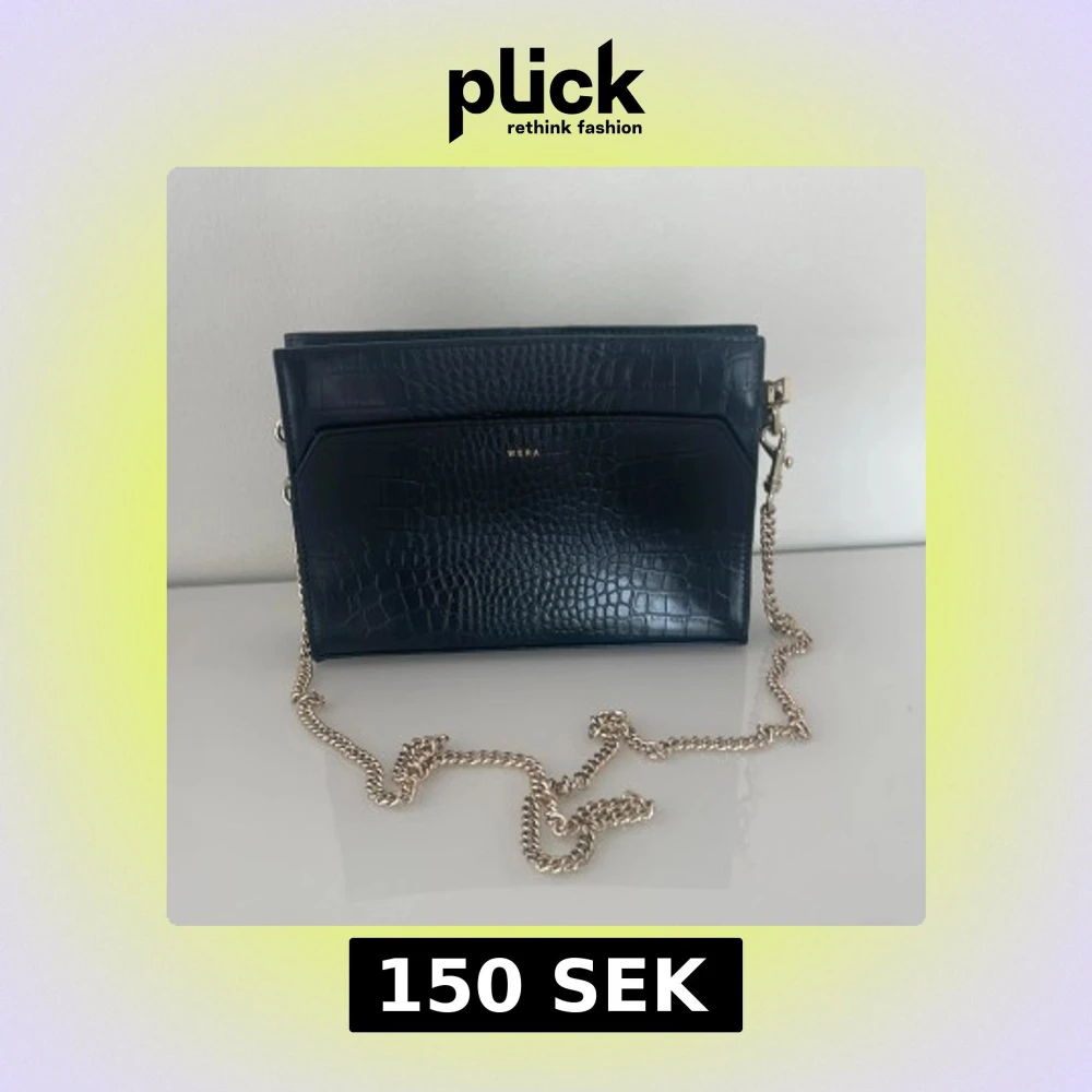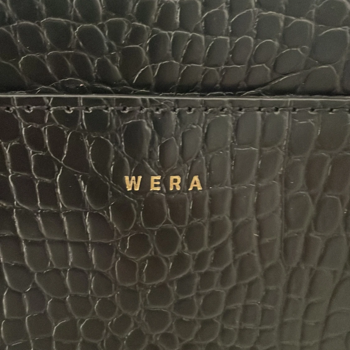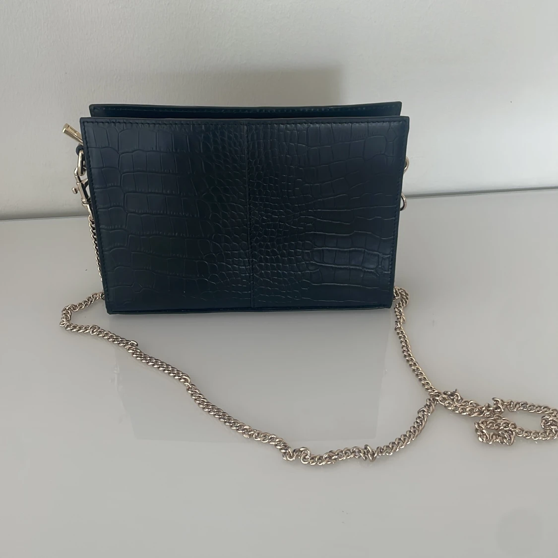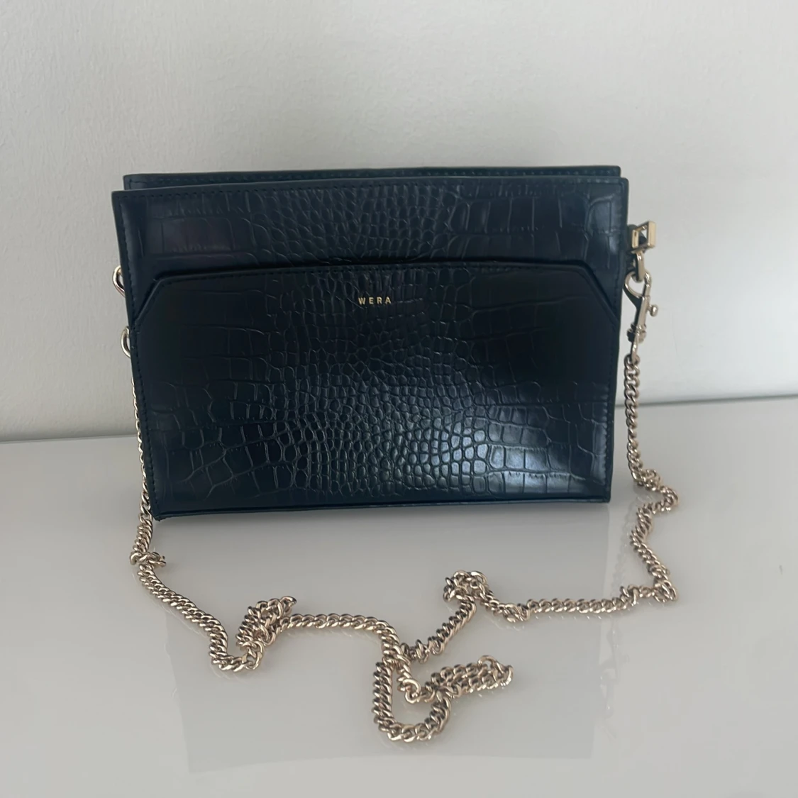 Stilren svart axelväska från Wera i präglat skinn med croco-mönster. Väskan har en guldfärgad kedja som axelrem och dragkedja upptill. Perfekt storlek för det viktigaste och snygg detalj till din outfit.