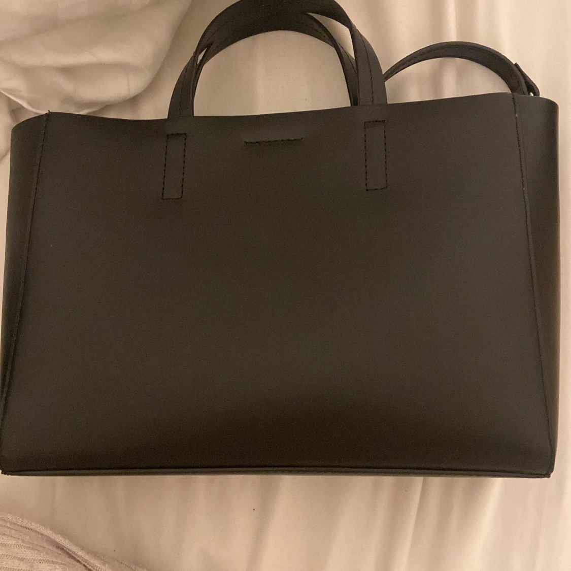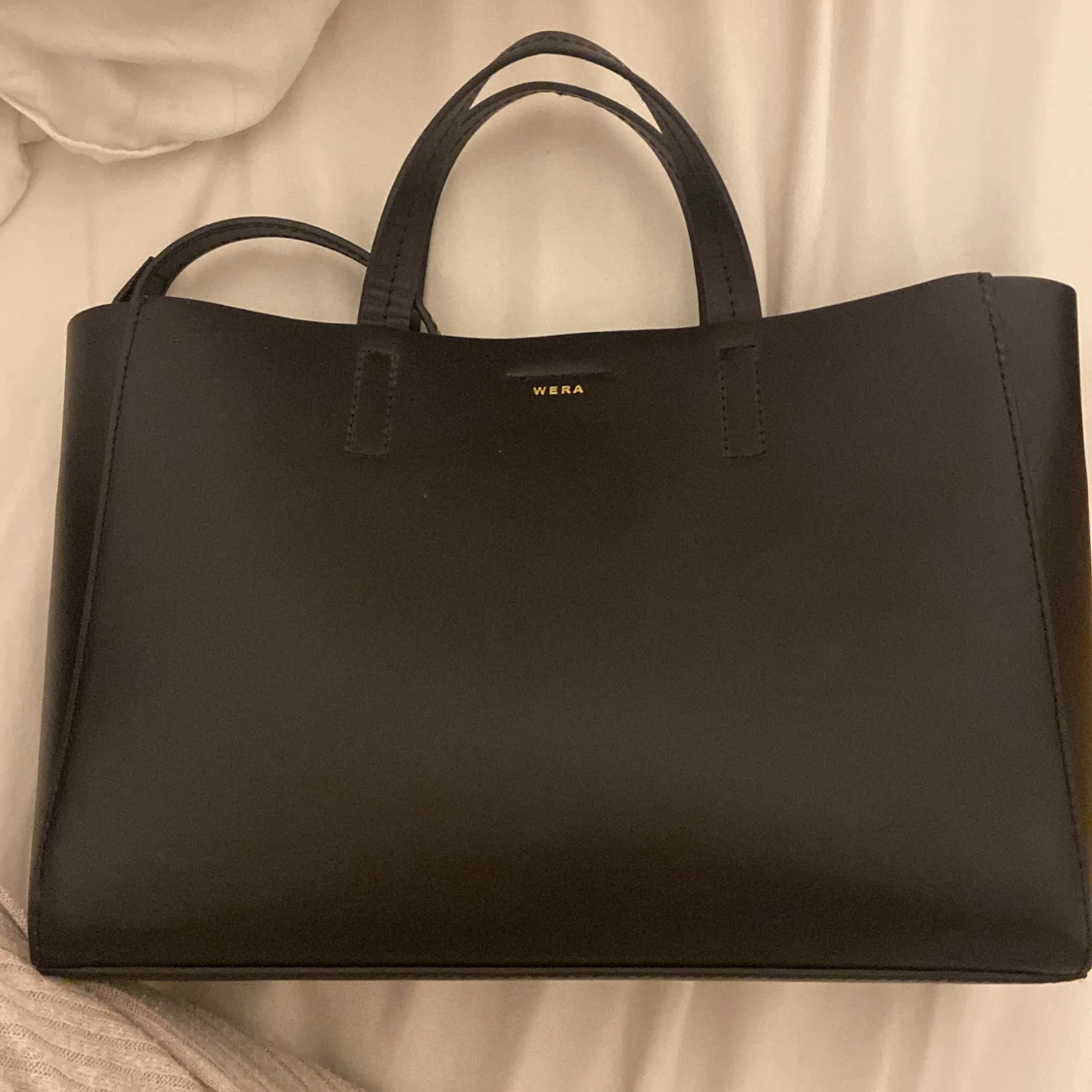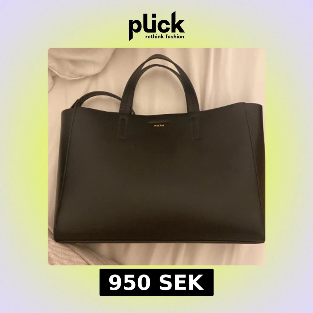Stilren svart handväska från Wera i slätt skinn. Väskan har två handtag, avtagbar axelrem och magnetlås. Insidan är rymlig med fack för småsaker. Perfekt för dig som gillar minimalistisk och klassisk design.