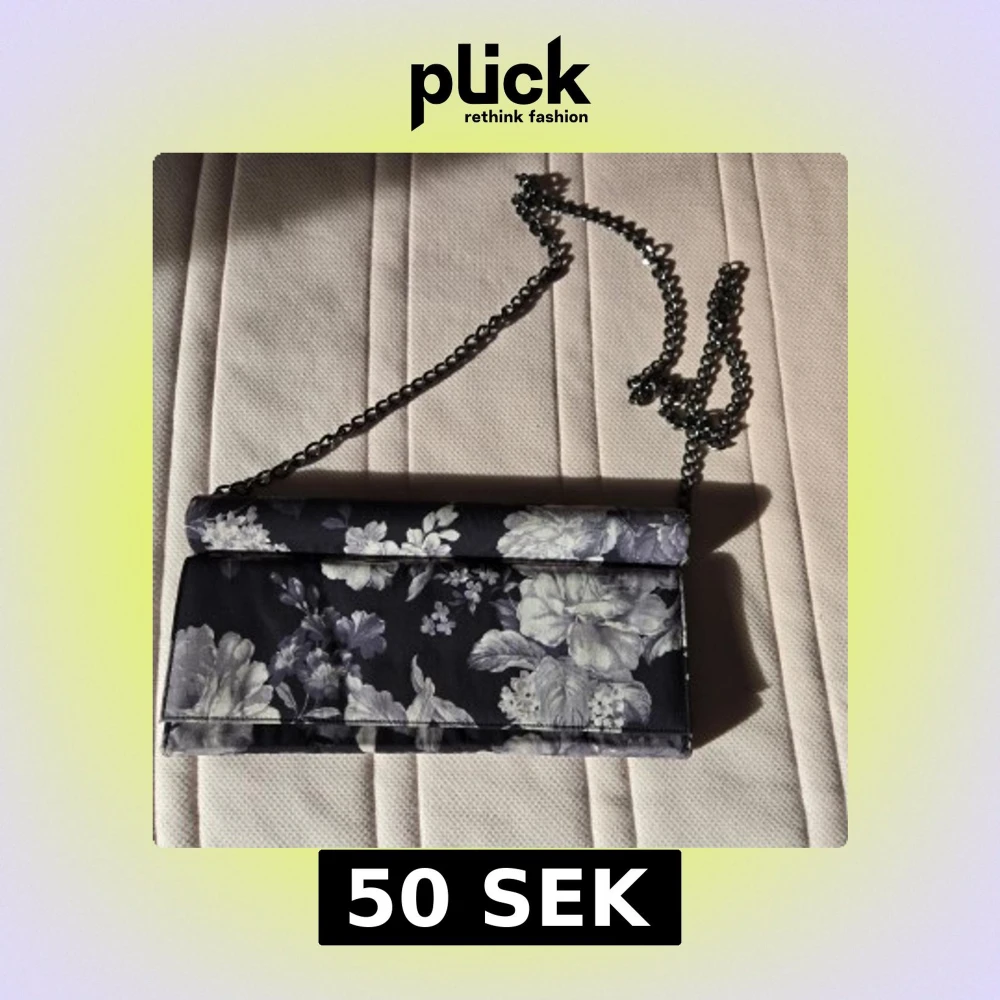 Snygg kuvertväska från Whyred med blommigt mönster i djupblått och grått. Väskan har en silverfärgad kedja som axelrem och ett praktiskt fack med dragkedja inuti. Perfekt för att lyfta din outfit med lite extra stil.