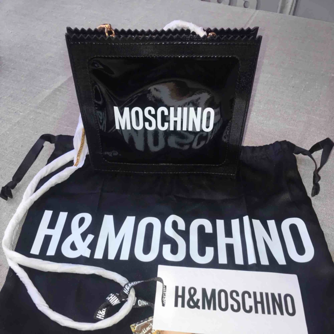 BUD PÅ TRADERA! En helt oanvänd MOSCHINO [TV] H&M axelremsväska. Den är i en lackad läderimitation med textryck fram och bak och med en guldpläterad ormlänk - Dustbag ingår och allt annat som kom med.-Jag tar inte ansvar för postnords hantering