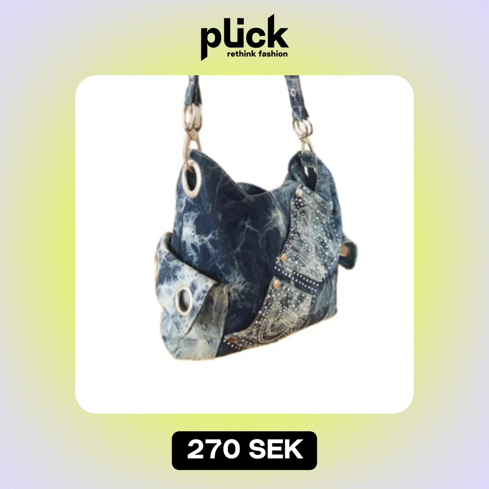 En medelstor jeans handväska med pärlor på sidan, urtvättad jeans textur, och metal detaljer (mått kmr efter förfrågan). Inga fel förutom små gräsfläckar på botten (syns på sista bilden)