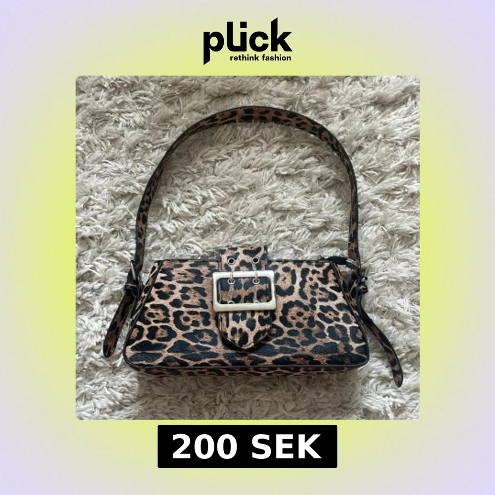 Cool axelväska med leopardmönster och bred axelrem. Väskan har ett stort silverfärgat spänne framtill och dragkedja upptill. Perfekt för dig som vill sticka ut med en edgy accessoar. Väskan är köpt second hand men var helt oanvänd, har nu använts fåtal gånger.