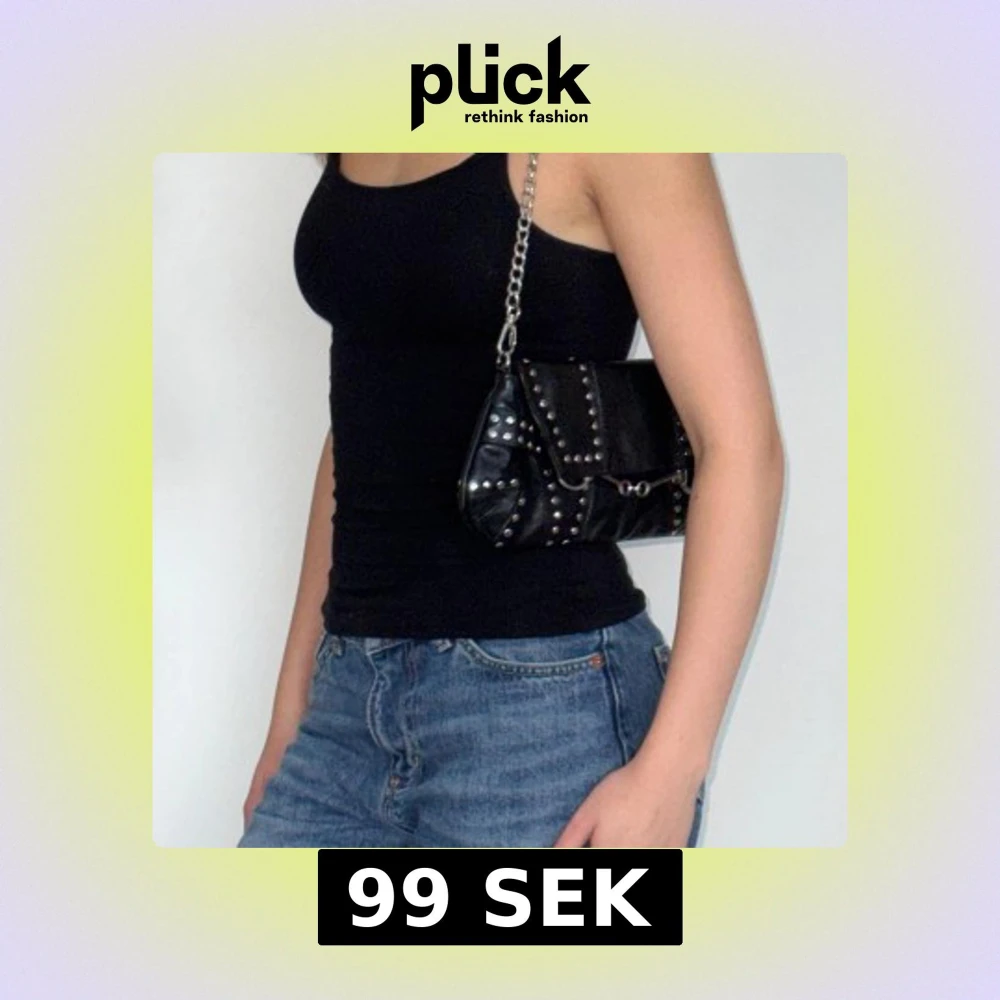 Cool svart axelväska från Friis & Company i skinn med silverfärgade nitar och kedja. Väskan har en rektangulär form, lock med spänne och detaljer i metall.