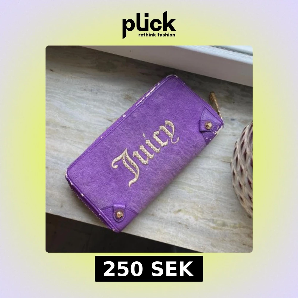 Lila plånbok från Juicy Couture med guldig Juicy-logga på framsidan. Plånboken har dragkedja i guld och flera fack inuti med svart tyg och kronmönster. Plånboken är äkta men utsidan är i dåligt skick därför priset, om det fortfarande är för mycket går det alltid att pruta🙏