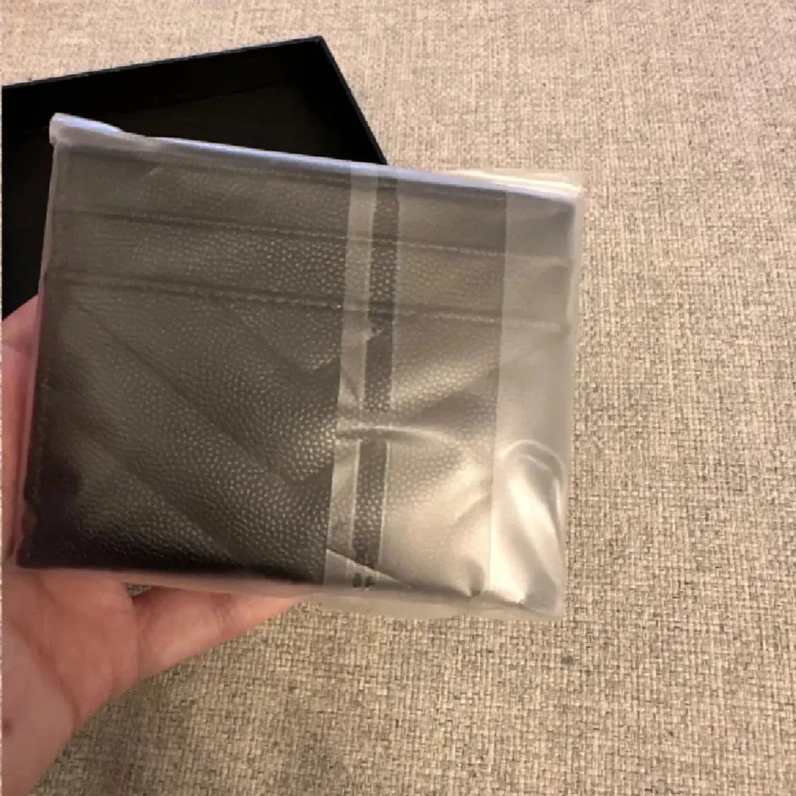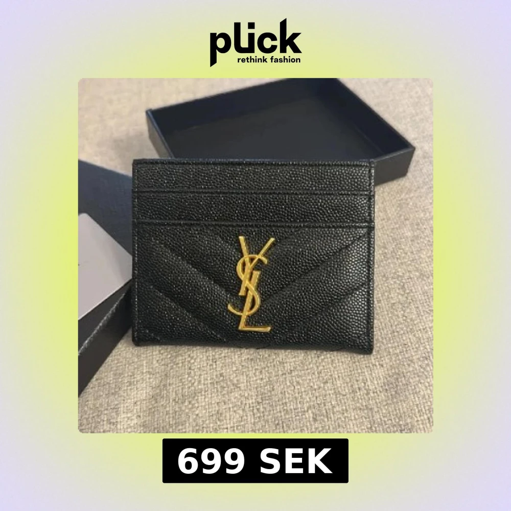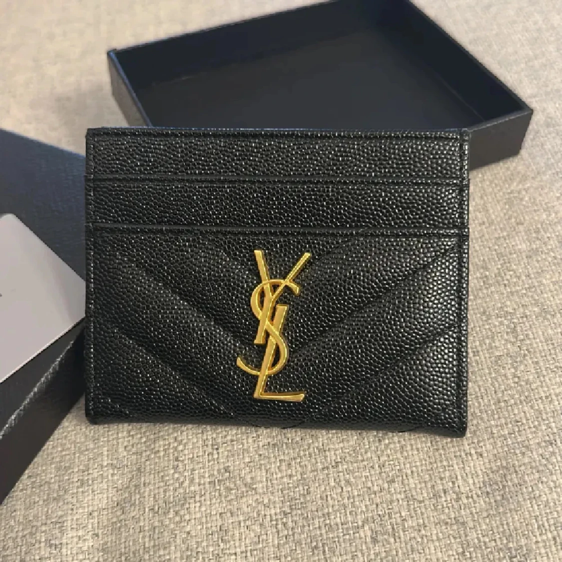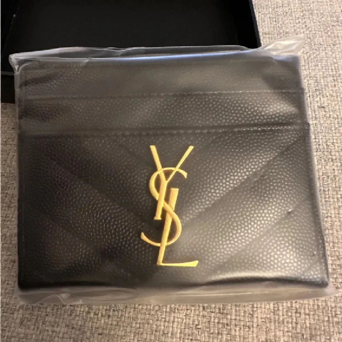 Snygg svart plånbok från YSL i äkta skinn med quiltad struktur och guldigt YSL-logo framtill. Plånboken har flera kortfack och stilren design som passar perfekt i fickan eller väskan.
