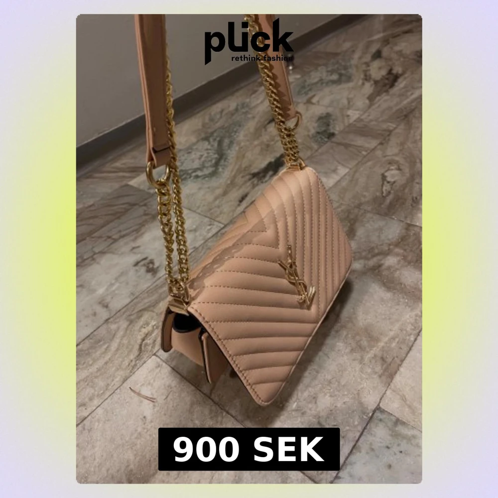 Supersnygg beige axelväska från YSL med quiltad design och guldiga kedjedetaljer. Väskan har ett klassiskt YSL-emblem framtill och en stilren, rektangulär form. Materialet är mjukt skinn och axelremmen kombinerar kedja med skinn för extra lyxig känsla. Köpt i Spanien för 1200 kr