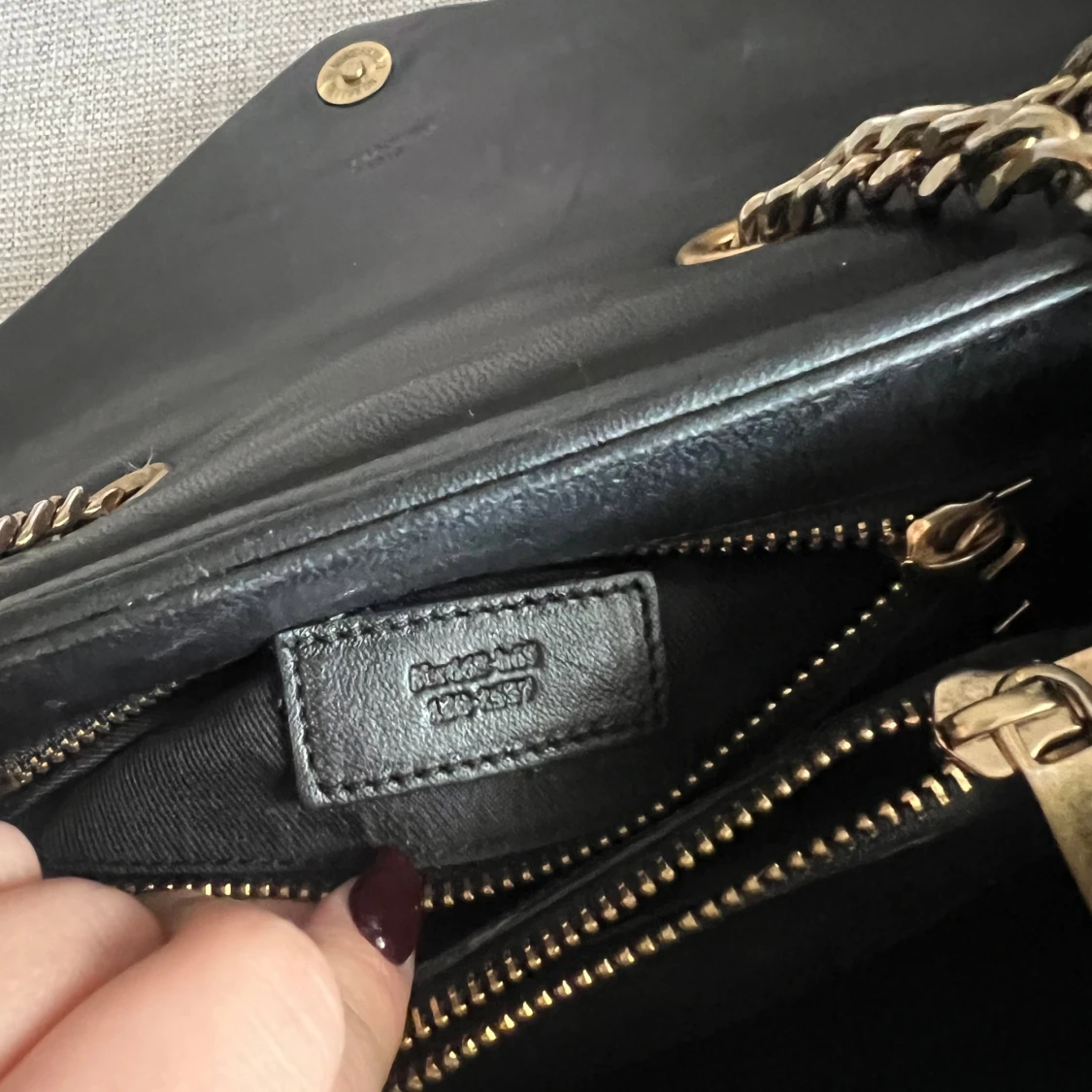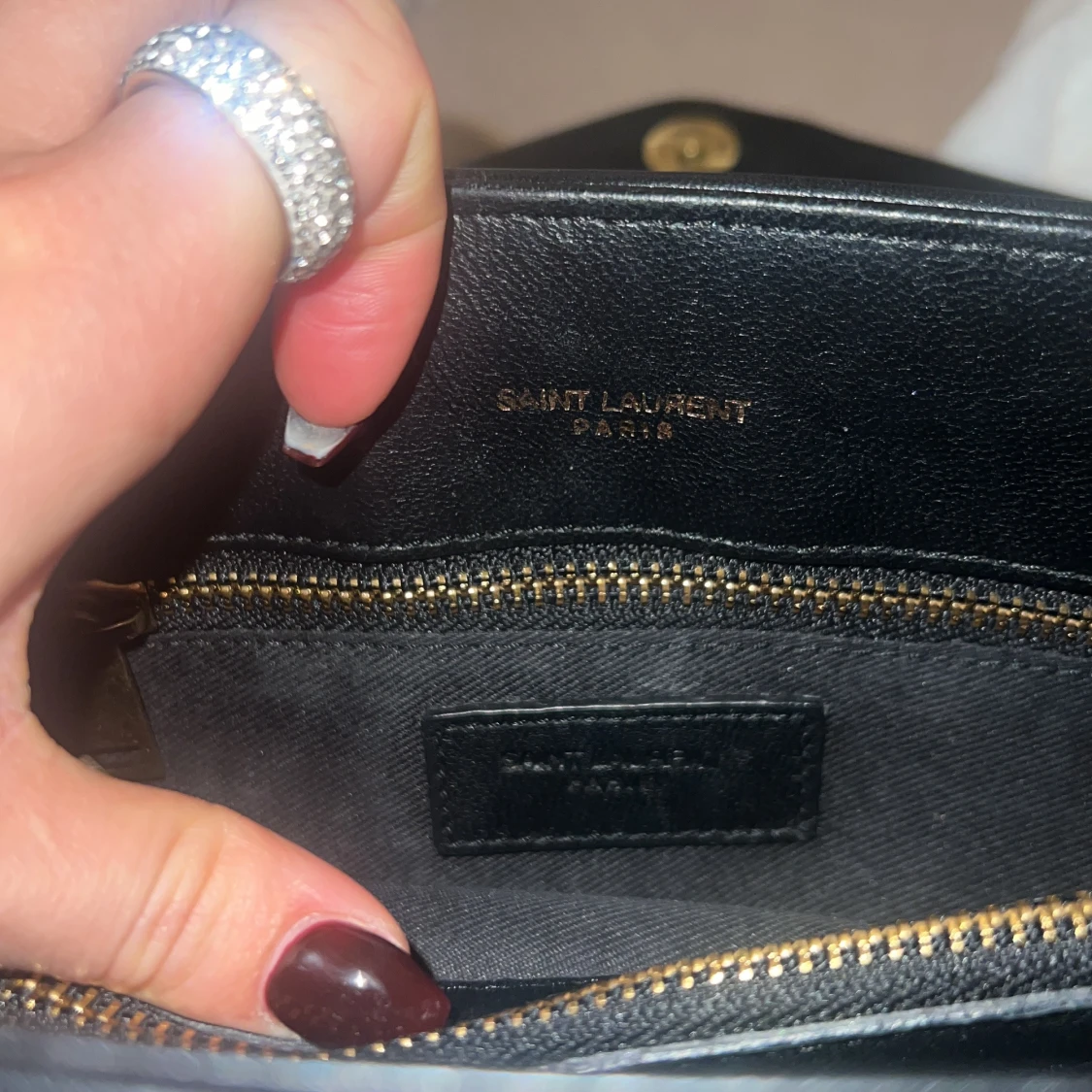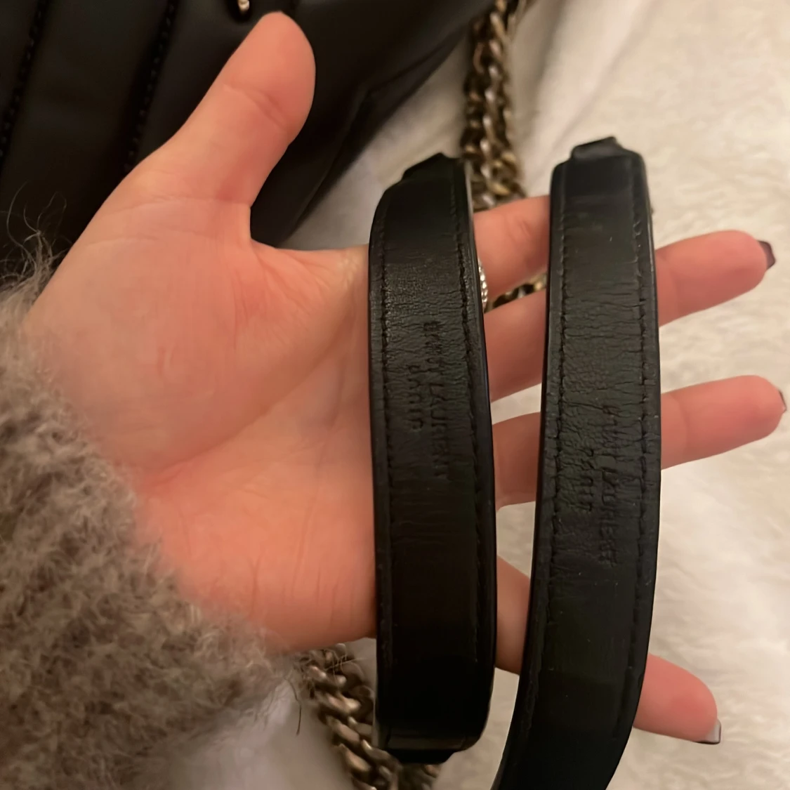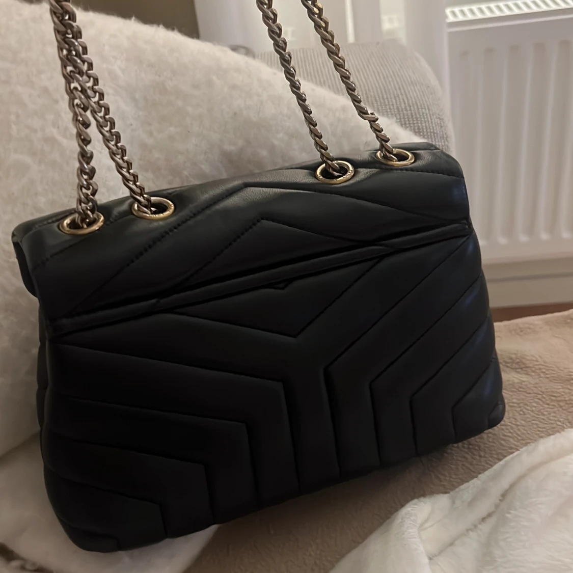 Säljer en svart quiltad axelväska från Saint Laurent med ikoniskt YSL-emblem i guld på framsidan. Väskan har kedjeremmar med läderdetaljer och magnetlås. Tillverkad i mjukt skinn med snygga, grafiska sömmar och dragkedjefack inuti. Köp ifrån Vinted men har tyvärr bara dustbagen🌟