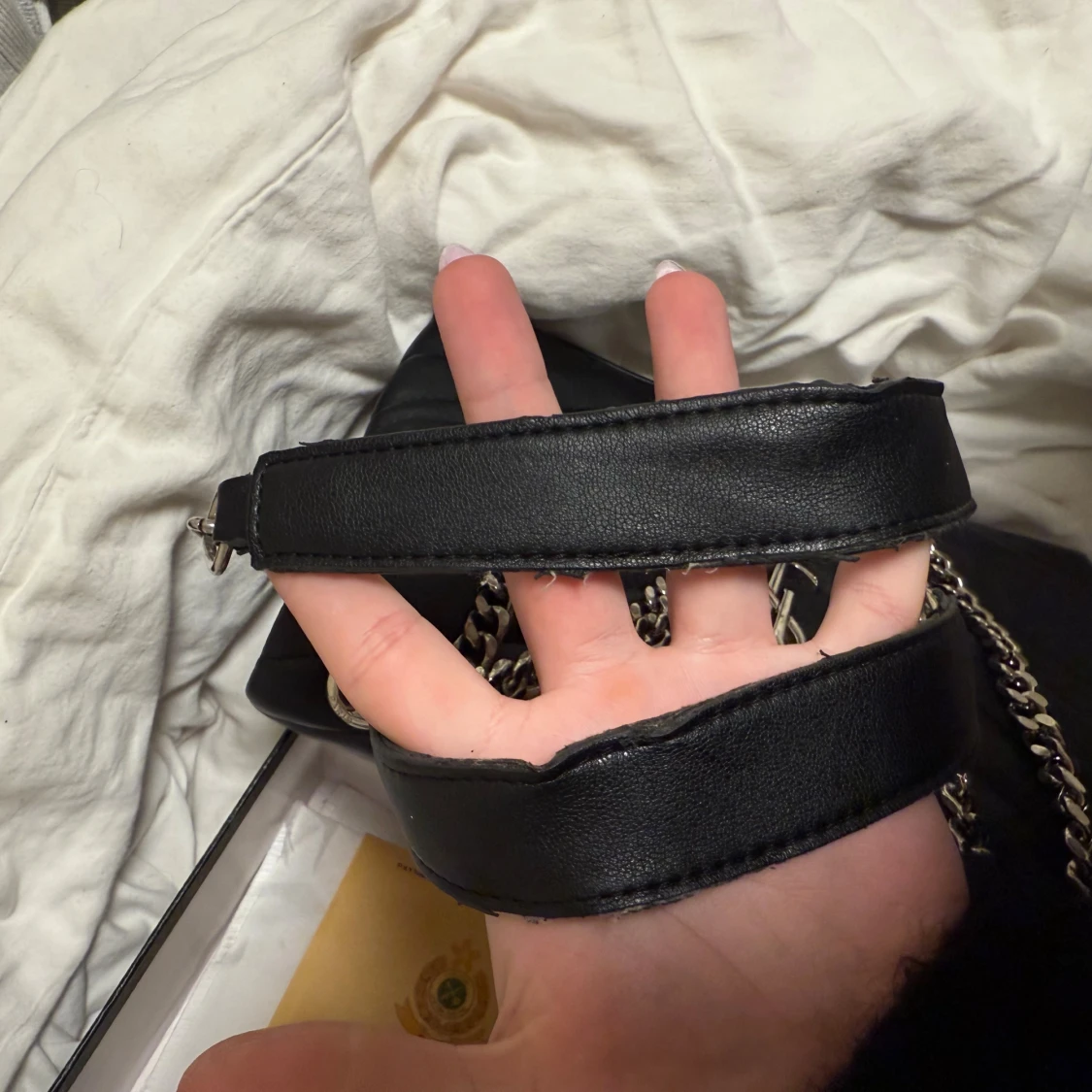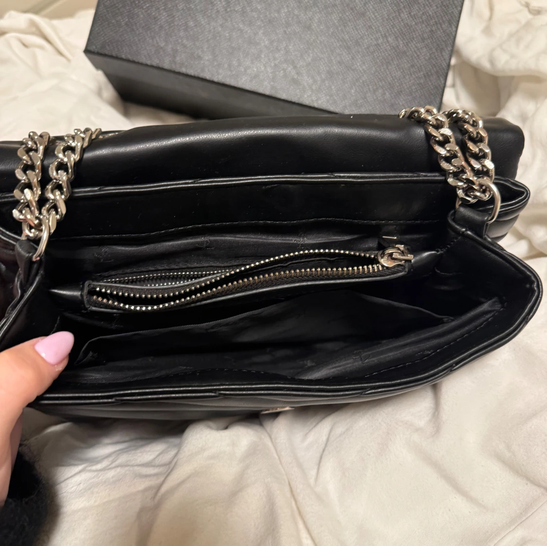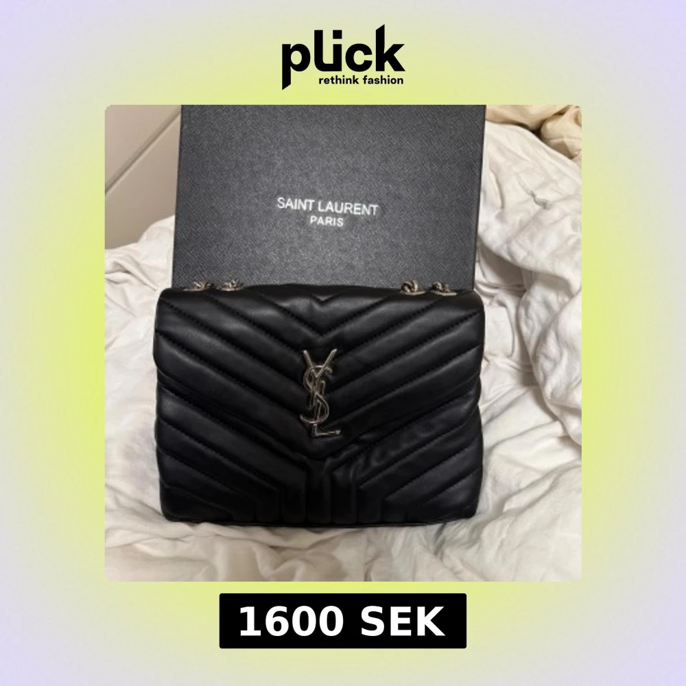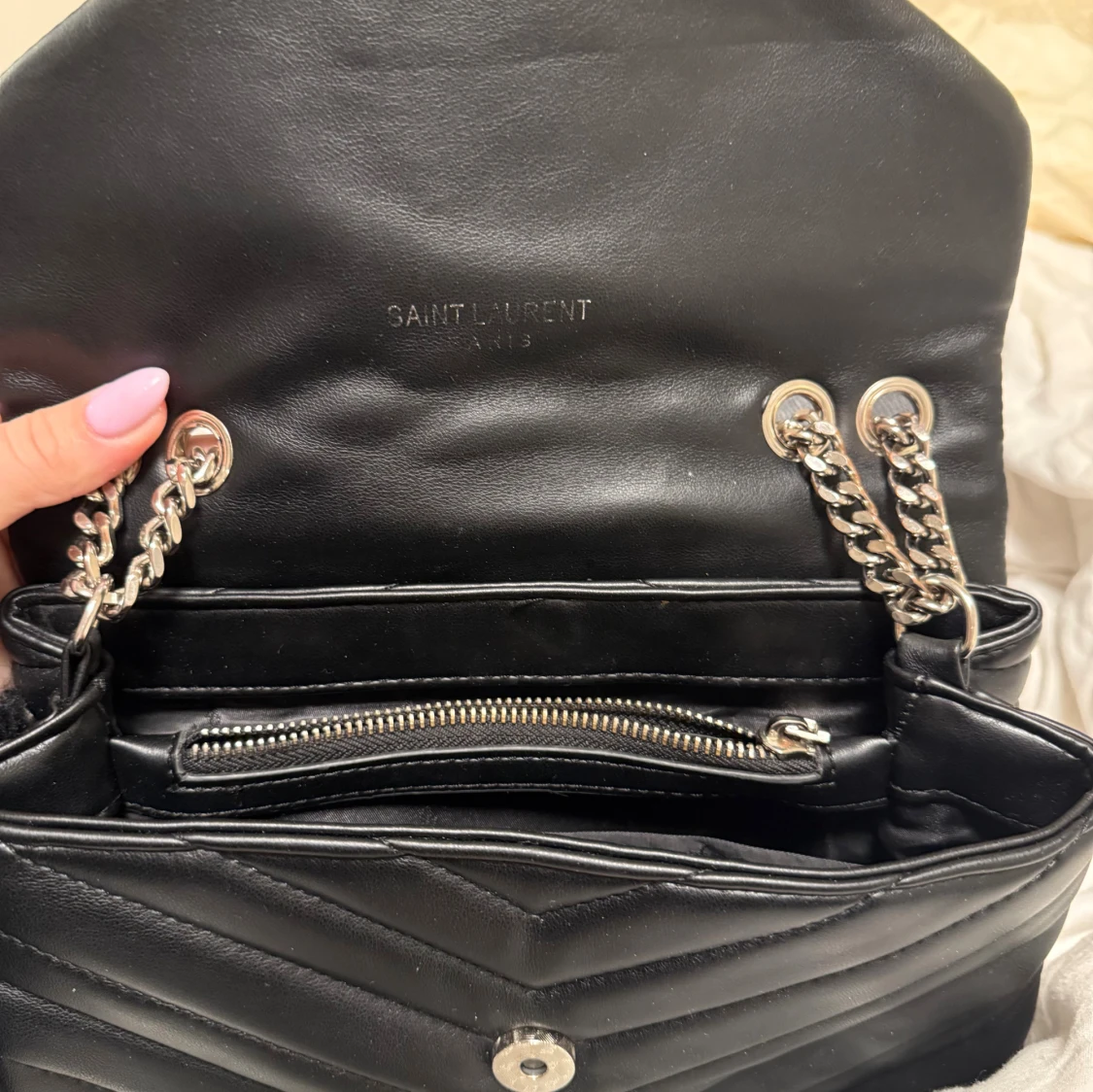 Snygg svart handväska från Saint Laurent med quiltad design och silverfärgad YSL-logga framtill. Väskan har kedjerem med skinnparti, magnetlås och flera fack inuti, inklusive ett med dragkedja. Perfekt storlek för det viktigaste och riktigt lyxig vibe.