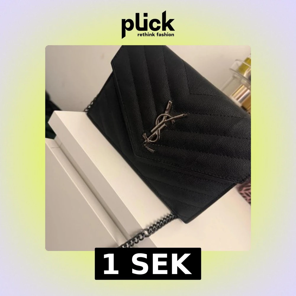 Snygg svart kuvertväska från YSL med klassisk silverfärgad logga framtill. Väskan är quiltad och har kedjerem i metall. Insidan har flera fack och dragkedja för smidig organisering. Perfekt storlek för det viktigaste och riktigt stilren design. Vi kan komma överens om ett bra pris tillsammans