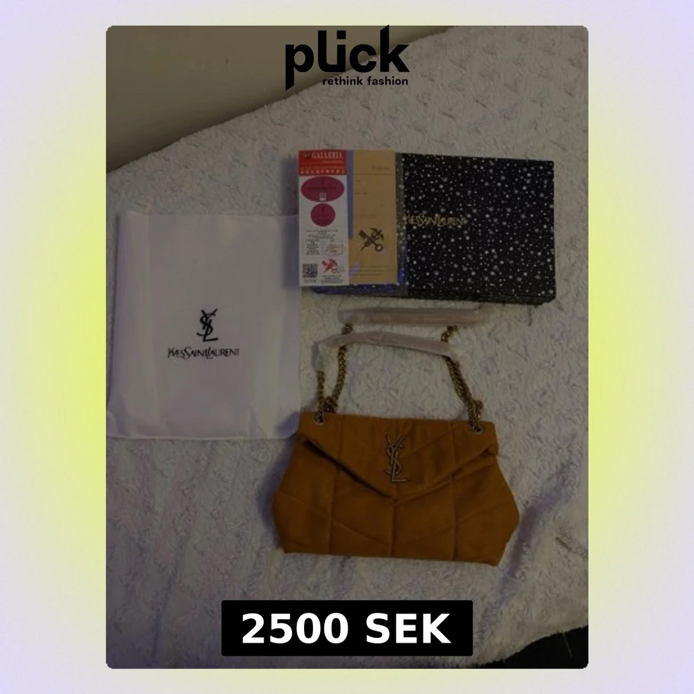Säljer en snygg gul axelväska från Yves Saint Laurent i mocka med quiltad design och guldfärgad kedja. Väskan har YSL-logga framtill och innerfack med dragkedja. Perfekt för dig som vill ha en lyxig och trendig accessoar.