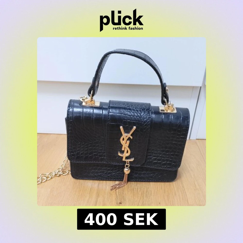 Säljer en svart handväska från YSL i croco-präglat skinn med guldiga detaljer och kedjerem. Väskan har ett stort YSL-emblem framtill och en dekorativ tofs. Stilren och lyxig design med både handtag och axelrem i kedja.