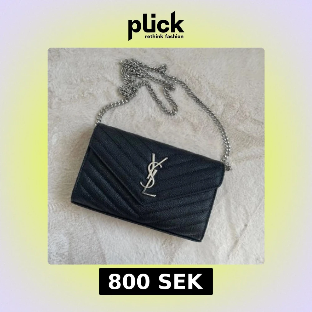Elegant svart axelväska från Saint Laurent med silverkedja och ikonisk logotyp på framsidan. Väskan har ett quiltat mönster och är tillverkad i skinn, vilket ger en lyxig känsla. Perfekt för att lyfta vilken outfit som helst. Oklart om den är äkta men box medföljs