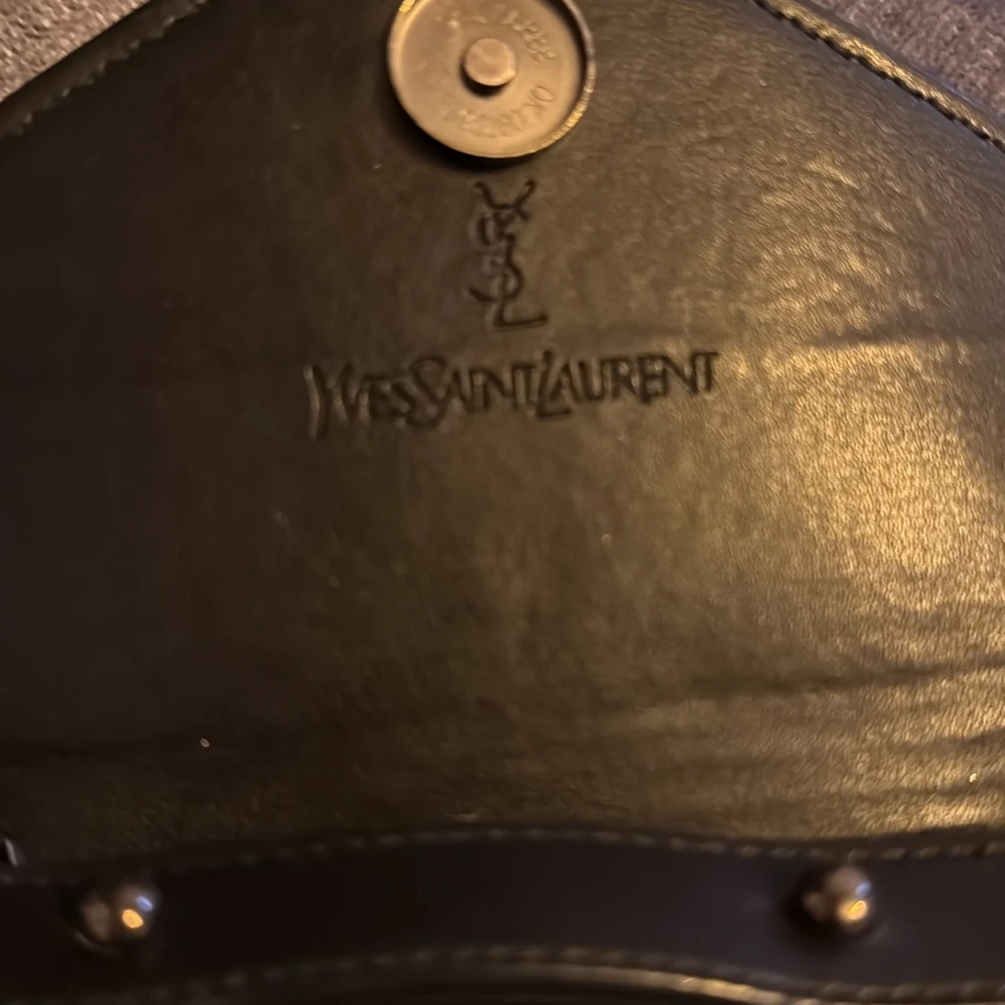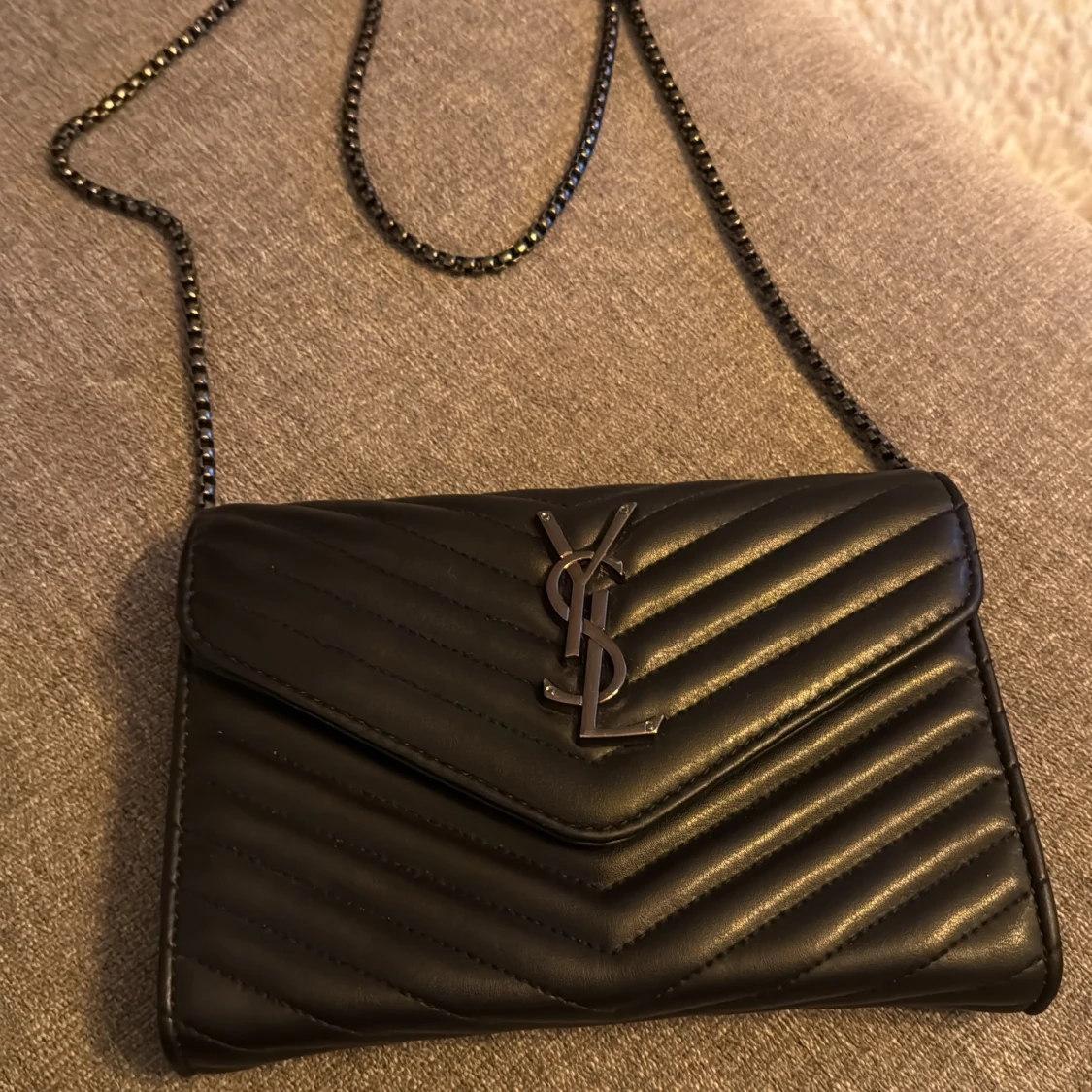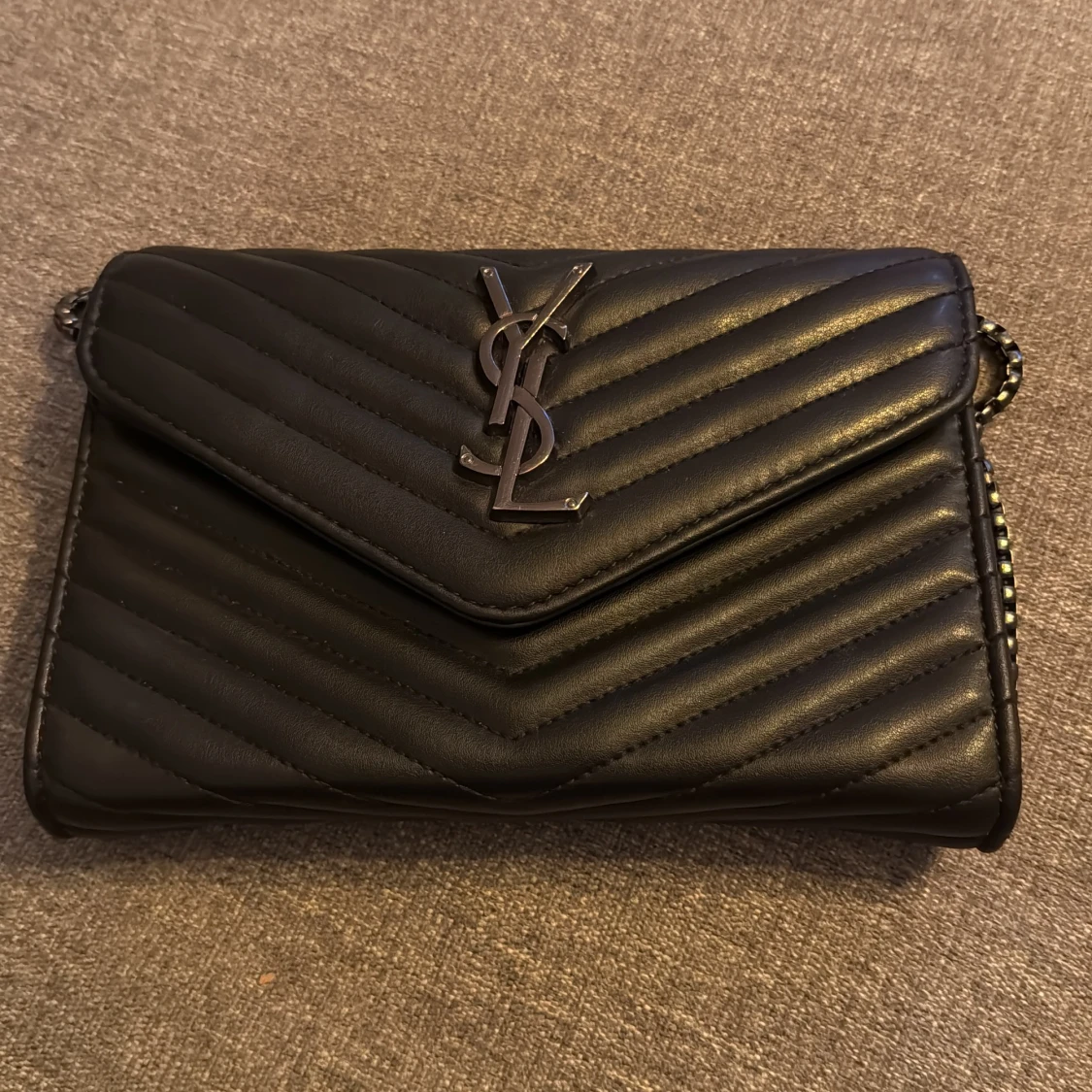 Snygg svart axelväska från YSL i quiltat skinn med silverfärgad kedja och ikonisk YSL-logga framtill. Väskan har kuvertformad front, magnetlås och ett fack med dragkedja inuti. Perfekt storlek för det viktigaste och ger en lyxig vibe till din outfit.