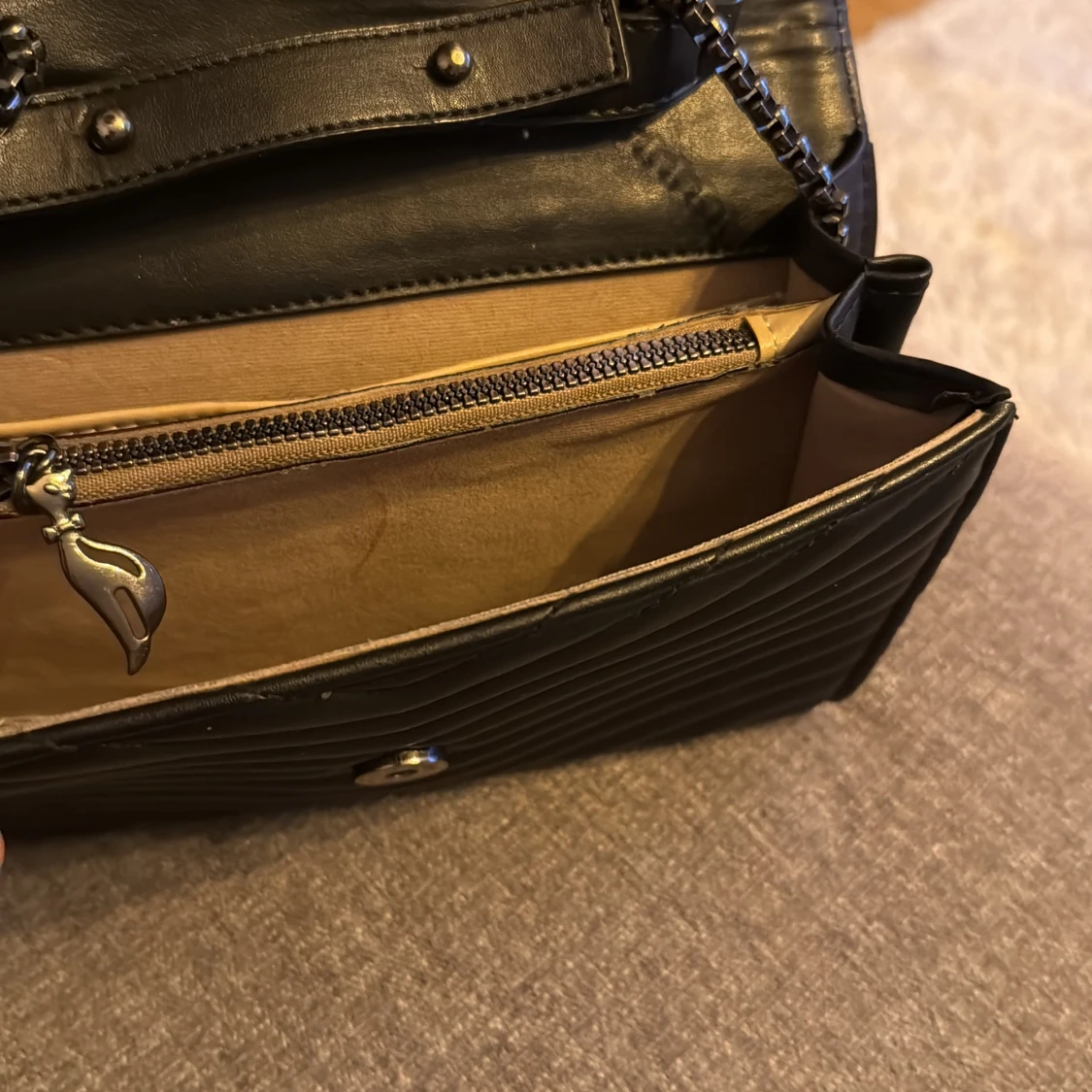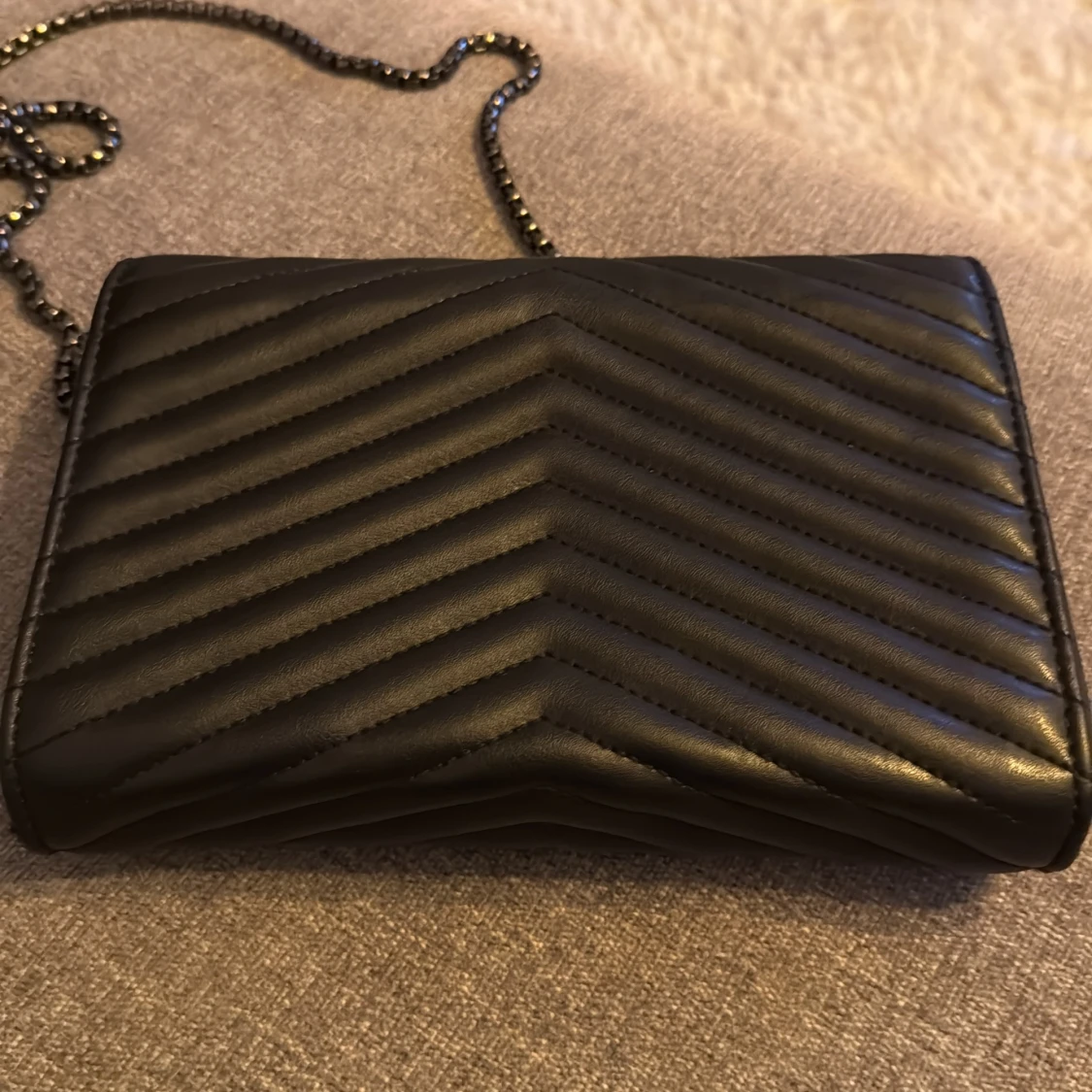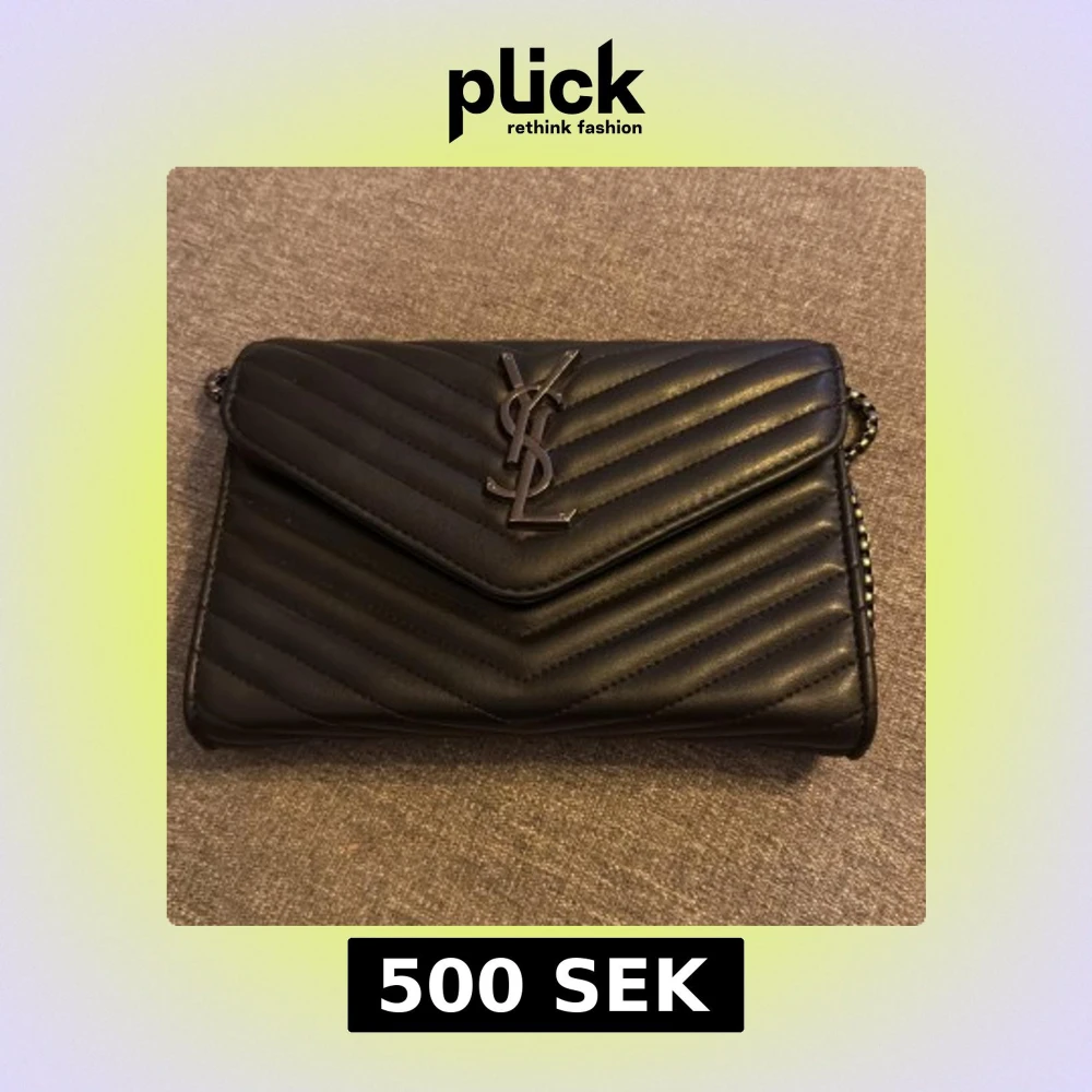 Snygg svart axelväska från YSL i quiltat skinn med silverfärgad kedja och ikonisk YSL-logga framtill. Väskan har kuvertformad front, magnetlås och ett fack med dragkedja inuti. Perfekt storlek för det viktigaste och ger en lyxig vibe till din outfit.