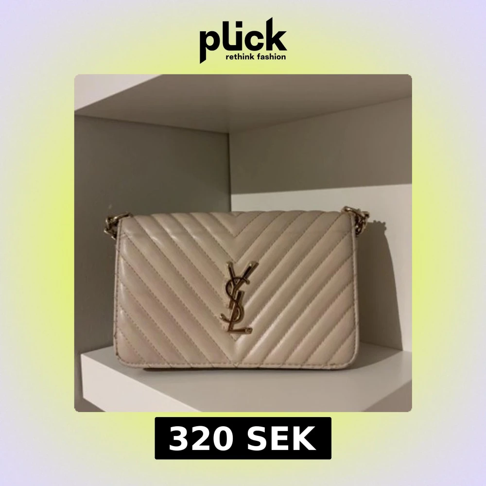 Snygg beige axelväska från YSL med guldiga detaljer och kedja. Väskan har ett quiltat mönster i V-form och klassisk YSL-logga framtill. Tillverkad i skinn och har en stilren, rektangulär form med flera fack på insidan.