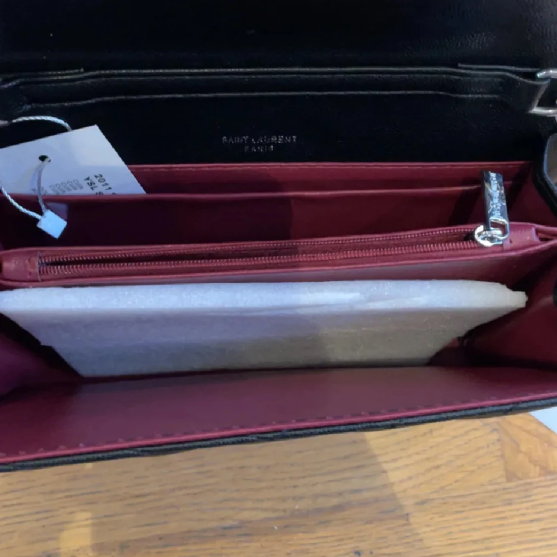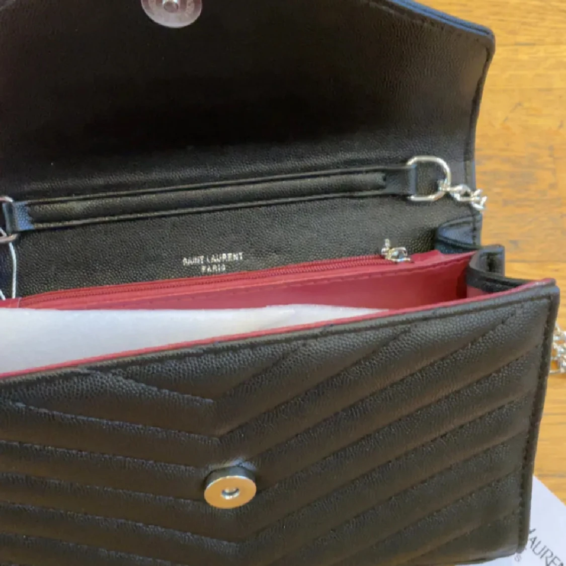 Snygg svart axelväska från YSL i quiltat skinn med silverfärgad kedja och ikonisk YSL-logga framtill. Väskan har ett rött innerfoder, dragkedjefack och magnetlås. Perfekt storlek för det viktigaste och ger en lyxig vibe till din outfit.