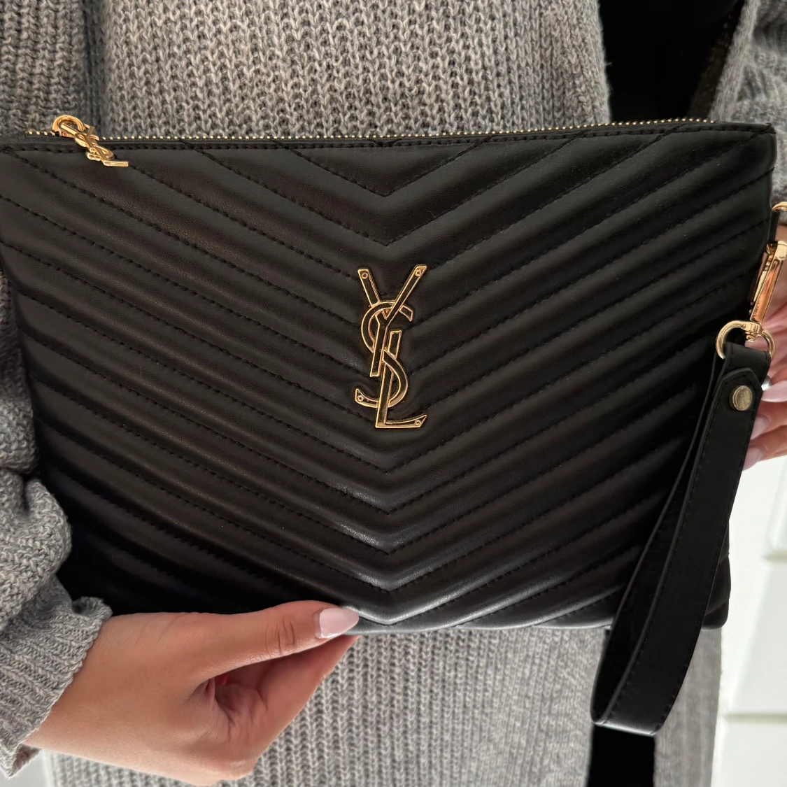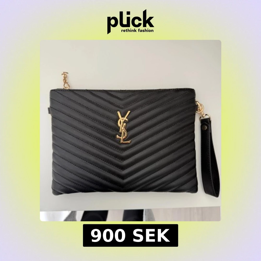 Snygg svart clutch väska från YSL med guldiga detaljer och logotyp framtill. Väskan är quiltad i ett chevronmönster och har en praktisk handledsrem samt dragkedja med YSL-hänge. Perfekt för dig som vill ha en stilren och lyxig accessoar.