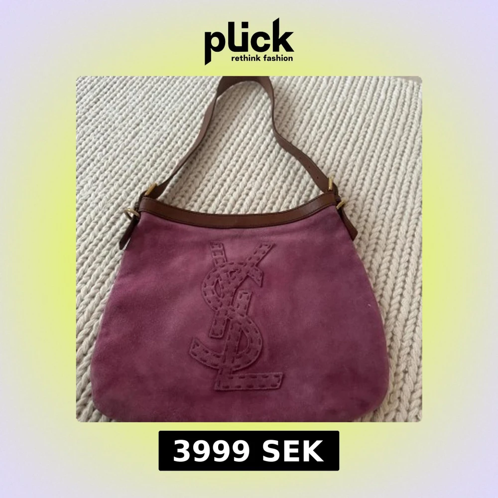 Säljer en snygg axelväska från Yves Saint Laurent i lila mocka med bruna skinn-detaljer och stort YSL-logo broderat på framsidan. Väskan har justerbar axelrem och innerfack med dragkedja. Perfekt för dig som vill ha en ikonisk och stilren väska.