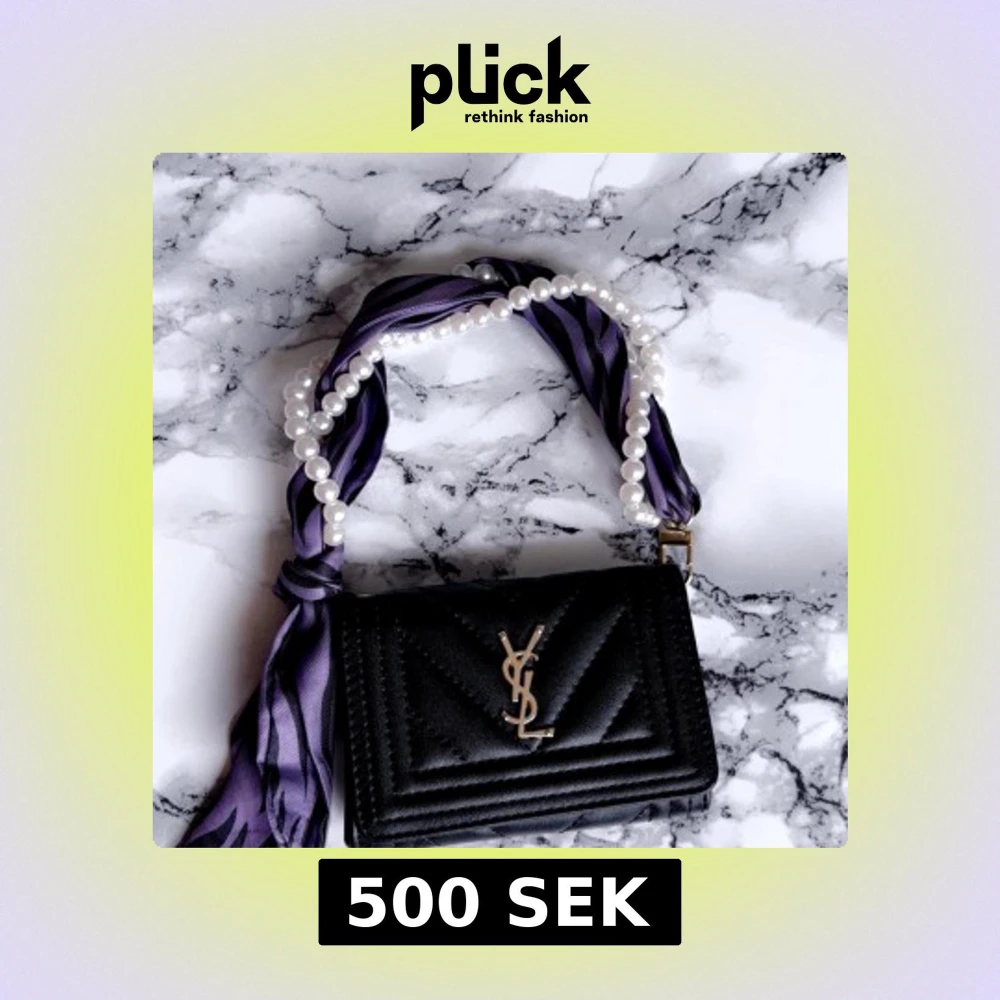 Snygg svart quiltad handväska från YSL med guldigt logospänne. Handtaget är dekorerat med lila scarf och pärlor för en unik och trendig look. Perfekt accessoar för att lyfta din outfit. Inte äkta men jättebra qualitet. Mini väska