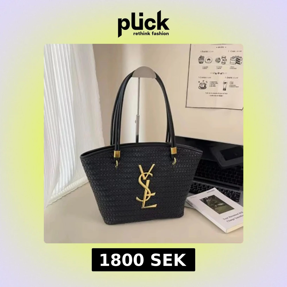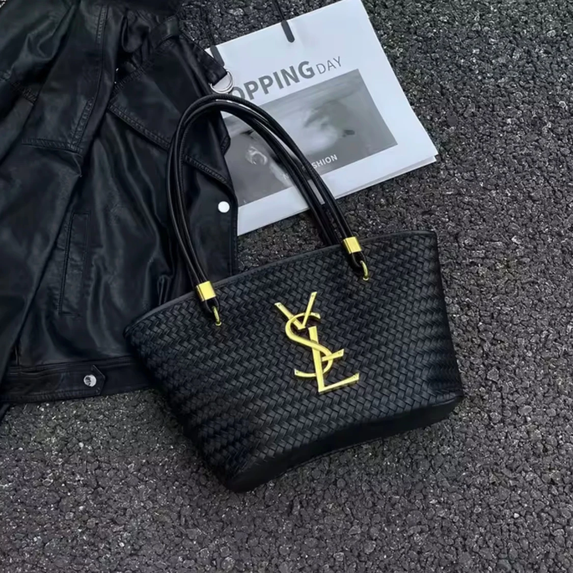Stilren svart handväska från YSL med flätad struktur och stora guldiga YSL-bokstäver framtill. Väskan har dubbla handtag med gulddetaljer och är tillverkad i skinn. Perfekt för dig som vill ha en lyxig och trendig accessoar.