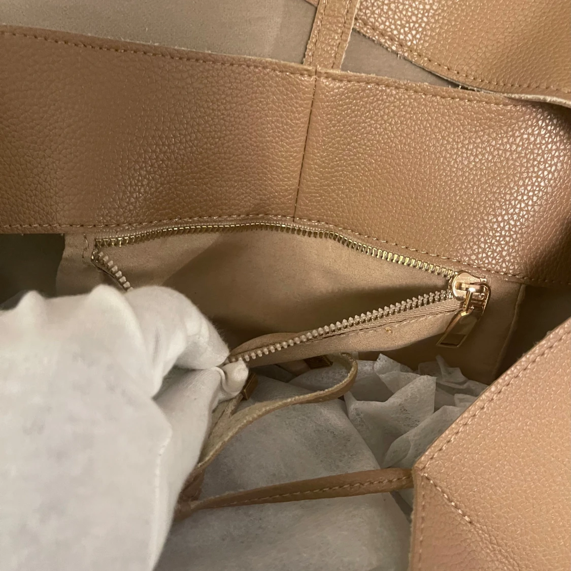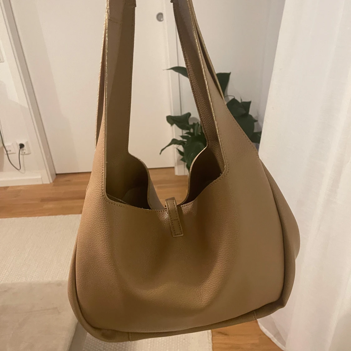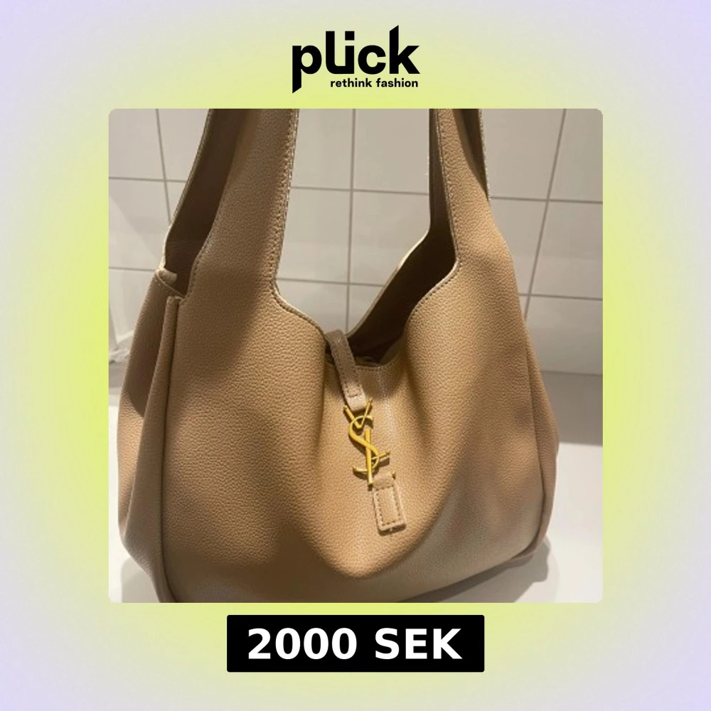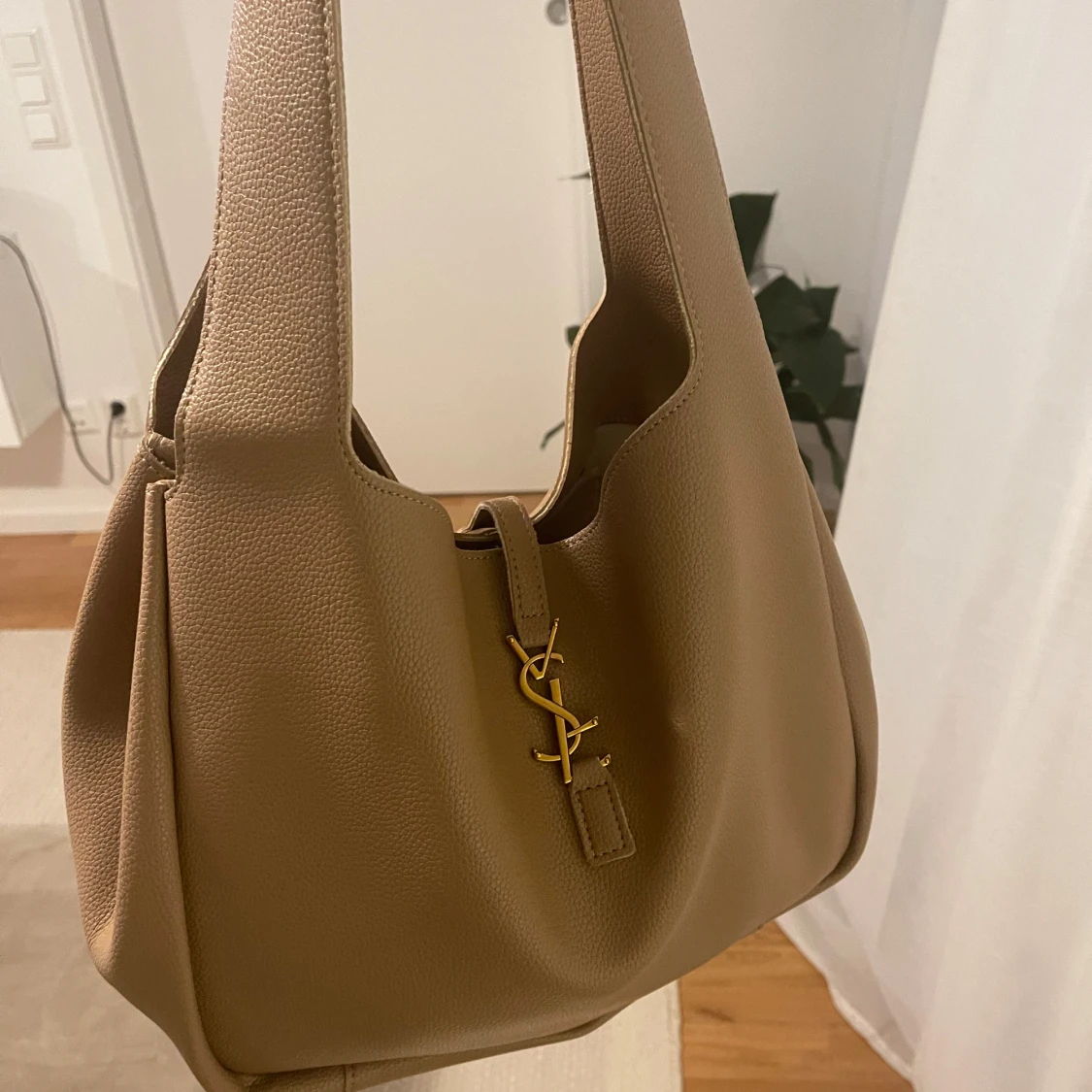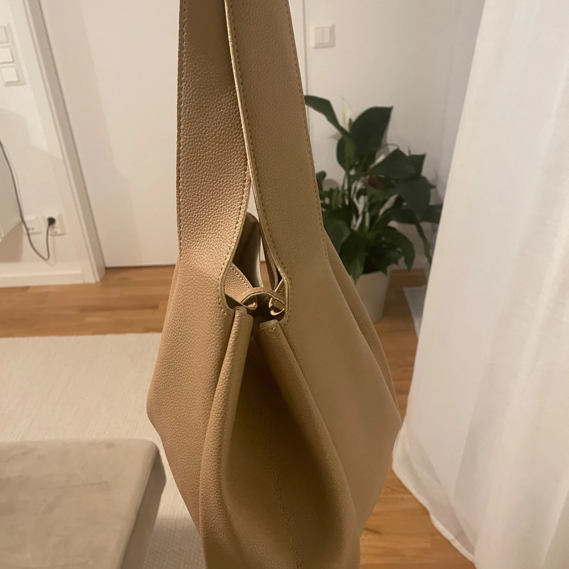 Snygg beige axelväska i mjukt, kornigt skinn. Väskan har en stilren design med bred axelrem och ikoniskt spänne i guld framtill. Perfekt storlek för att få plats med allt du behöver och ger en lyxig känsla till din outfit.