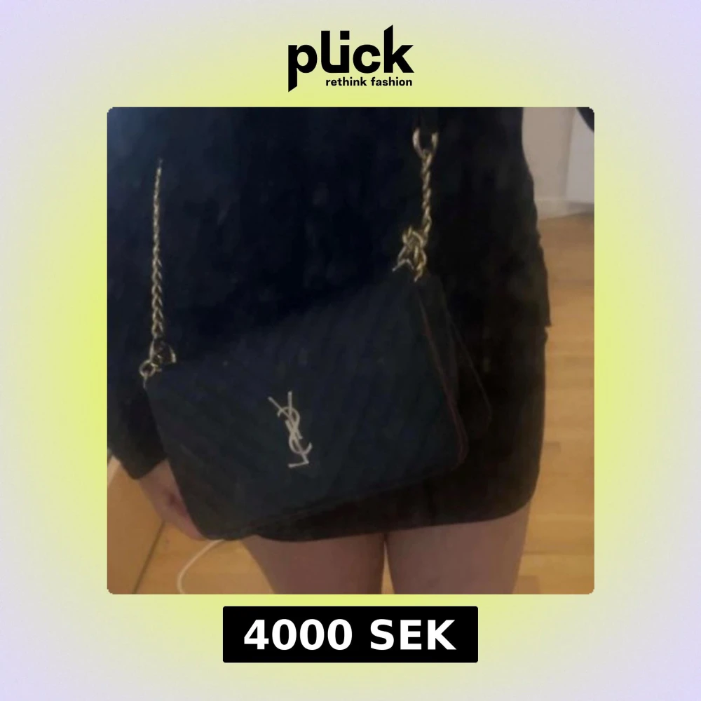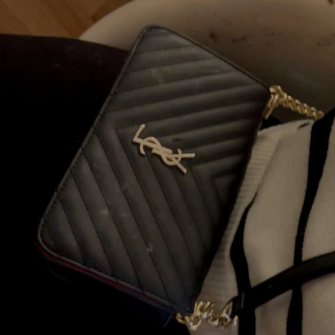 Säljer en svart axelväska från YSL med klassisk guldlogga framtill. Väskan är quiltad och har en kedjerem i guld. Tillverkad i skinn och har en stilren, rektangulär form som passar perfekt till din outfit.