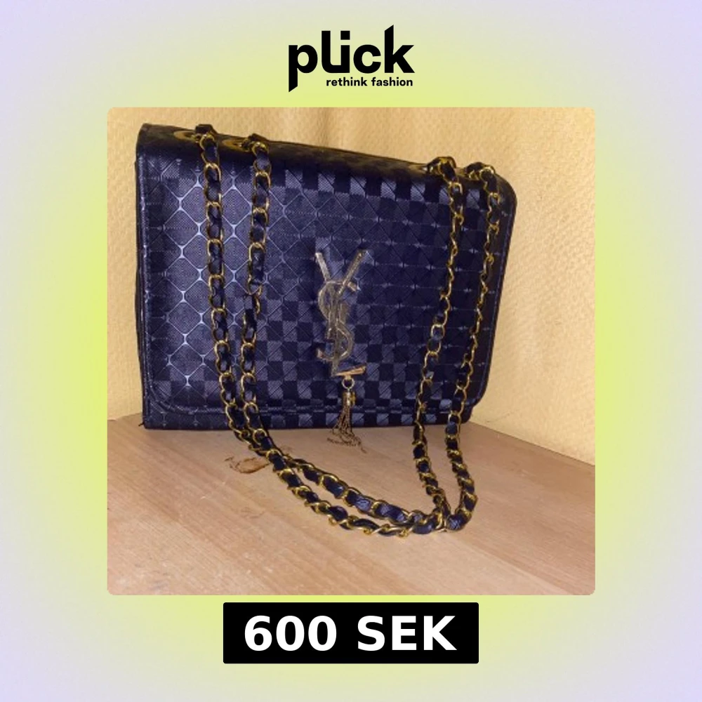 Snygg svart axelväska från YSL med rutigt mönster och guldiga detaljer. Väskan har en lång kedjerem i guld och svart, samt YSL-logga framtill med hängande tofs. Perfekt storlek för det viktigaste och ger en lyxig känsla till din outfit.
