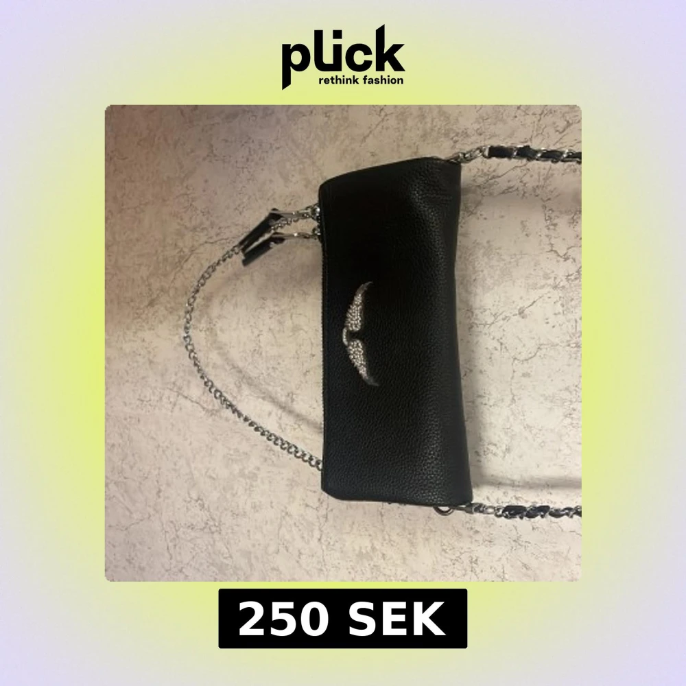 Snygg svart axelväska i skinn med en cool kedjerem och ett glittrigt vingmotiv på framsidan. Perfekt för att ge din outfit en edgy touch. Väskan har en dragkedja för säker förvaring av dina saker.