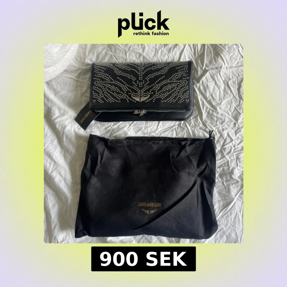 Svart kuvertväska i skinn från Zadig & Voltaire med coola silverfärgade nitar i mönster och deras ikoniska vinglogga framtill. Väskan har dragkedja och medföljer en silverkedja som axelrem. Perfekt för att lyfta vilken outfit som helst.
