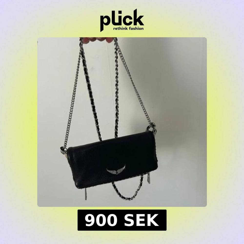 Säljer en svart axelväska från Zadig & Voltaire med silverfärgad kedjerem och en snygg vingdetalj i metall framtill. Väskan är i skinn och har en stilren, avlång form. Ny pris 2000-3000kr.