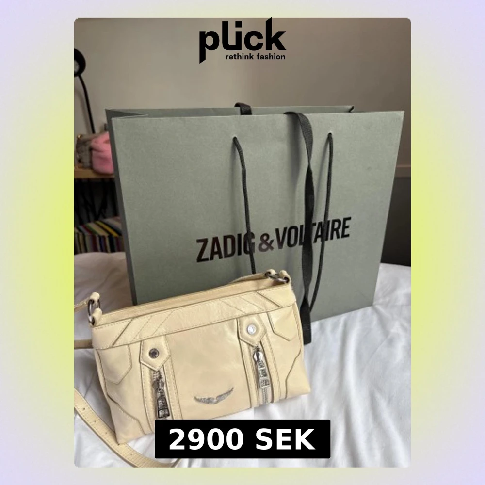 Snygg beige axelväska från Zadig & Voltaire i skinn med coola silverdetaljer och två dragkedjor framtill. Väskan har en justerbar rem och ett litet emblem med vingar på framsidan. Perfekt storlek för det viktigaste och ger en trendig vibe till din outfit. Köpt i Paris i somras för 4550kr. Kan gå ner i pris vid snabb affär🩷