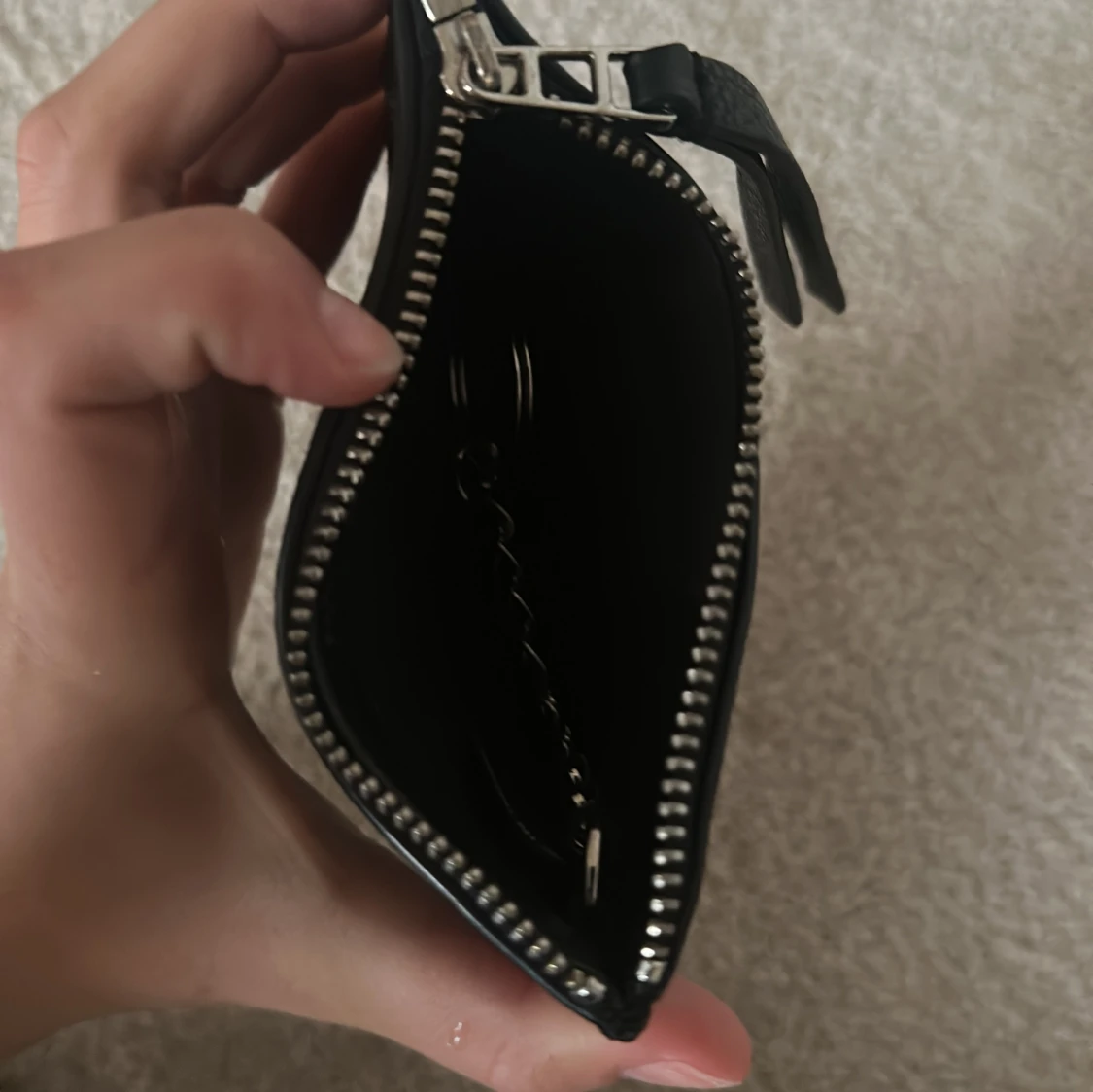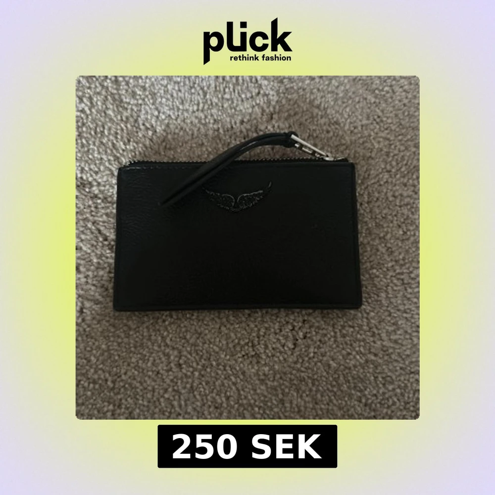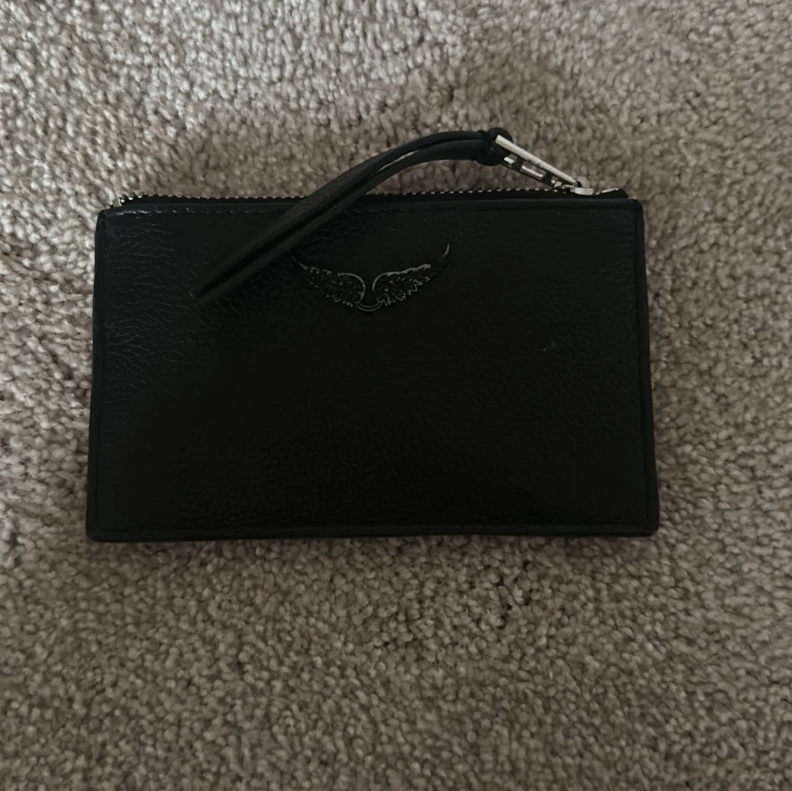 Snygg svart plånbok i skinn med silverfärgad dragkedja och ett stilrent vingmotiv på framsidan. Praktisk storlek med dragkedja runt om och en smidig rem för att hålla i. Perfekt för kort, mynt och småsaker. Lite sliten bara vid märket annars brs