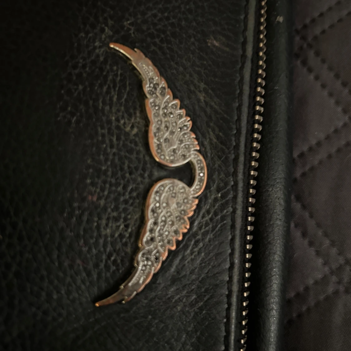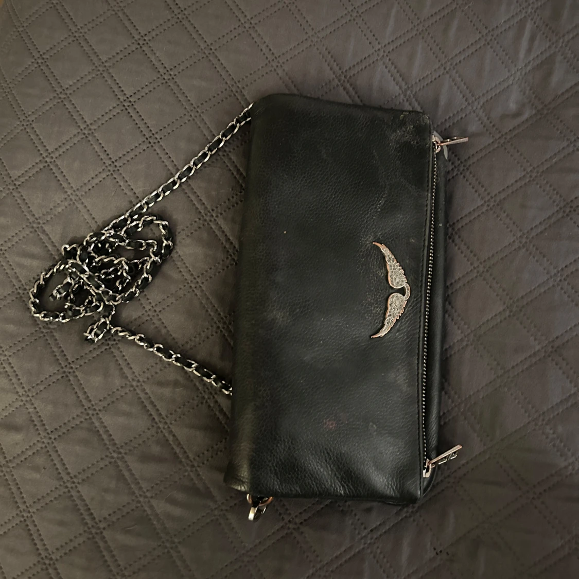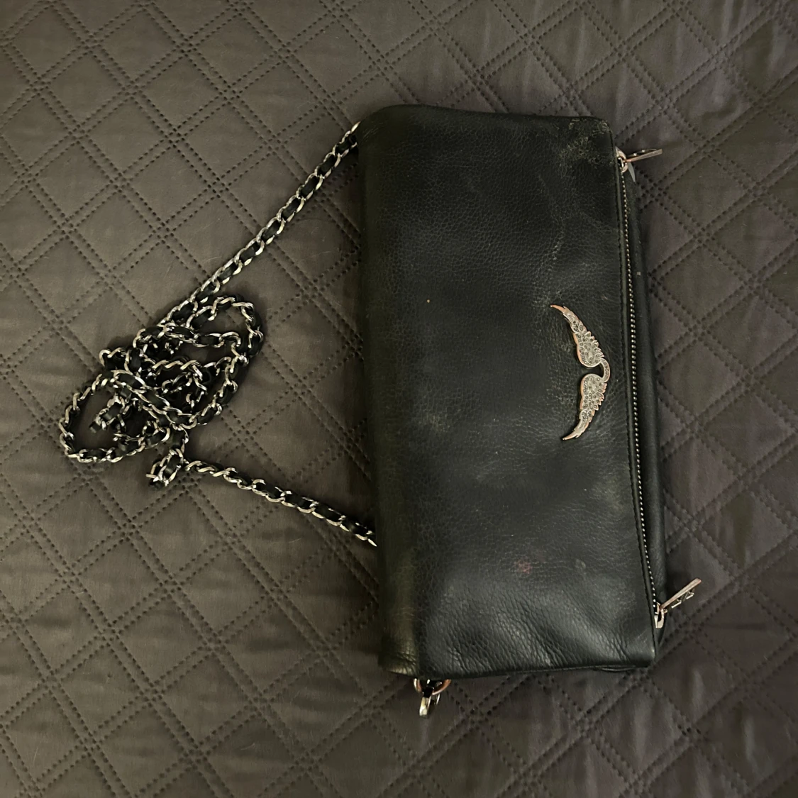 Snygg svart zadigvöska i skinn med kedjedetaljer . Väskan är äkta och köptes för 3000. Observera att den är ganska använd med sminkfläckar (har inte testat att få bort dem) samt missfärgning på silver-örnen. Kanten på väskan är också lite trasig. pris kan diskuteras.
