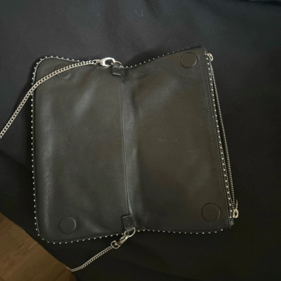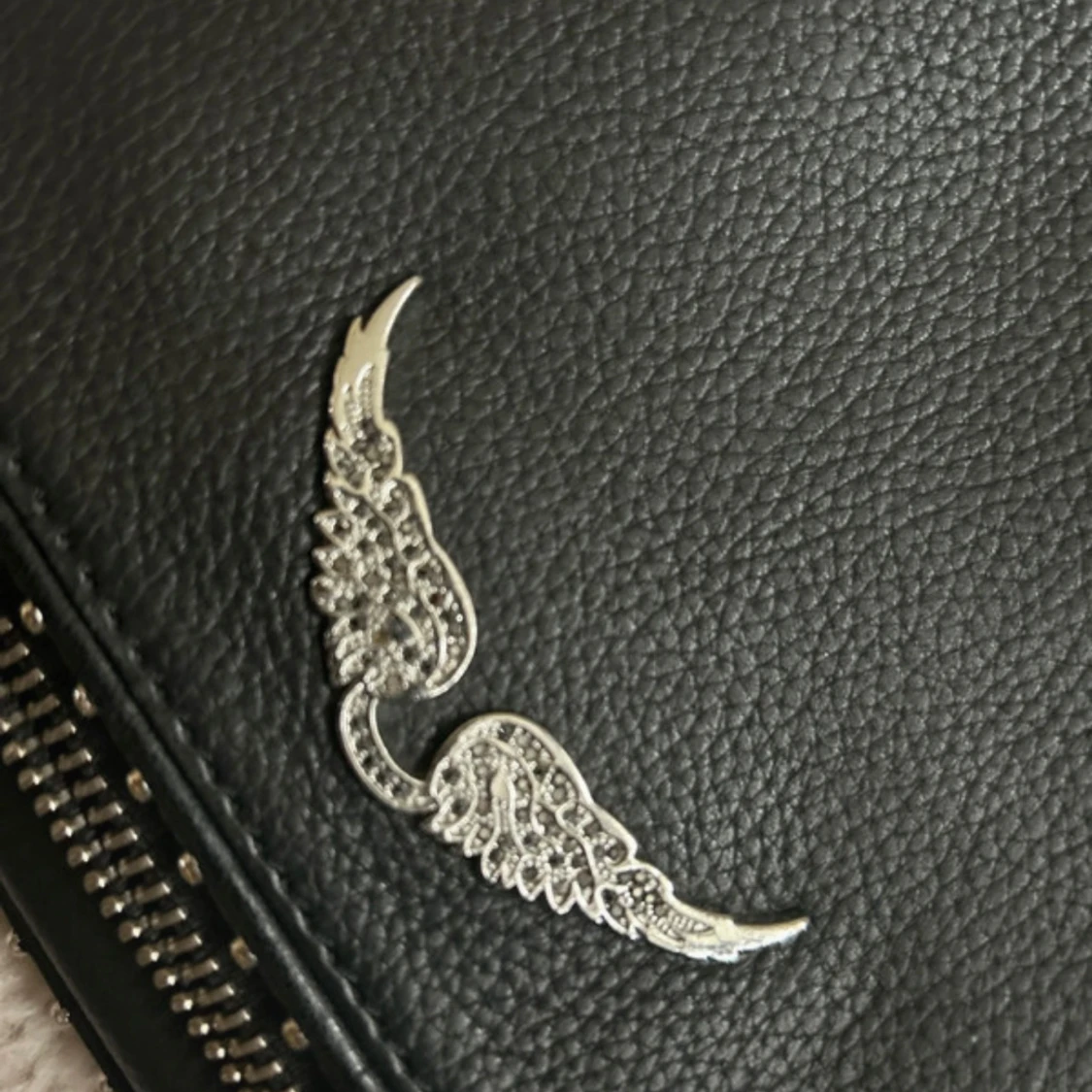 Snygg svart axelväska i skinn med en cool kedjerem och en unik vingdetalj i silver på framsidan. Väskan har en dragkedja och nitar längs kanterna som ger en edgy look. Perfekt för att lyfta din outfit! Det följer med en rem till till väska. Kvitto finns.