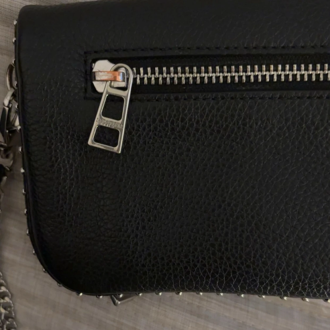 En äkta Zadig&Voltaire väska i den mindre modellen. Har tyvärr tappat bort äktahetsbeviset och påsen väskan kom i, men det är äkta då jag köpte den på Zalando. Jag köpte den för 3300kr för ca 3-4år sedan, men den ända defekten på väskan visas på sista bilden. På dragkedjan på baksidan har den tappat lite färg men inget man tänker på. Annars är den som ny💕